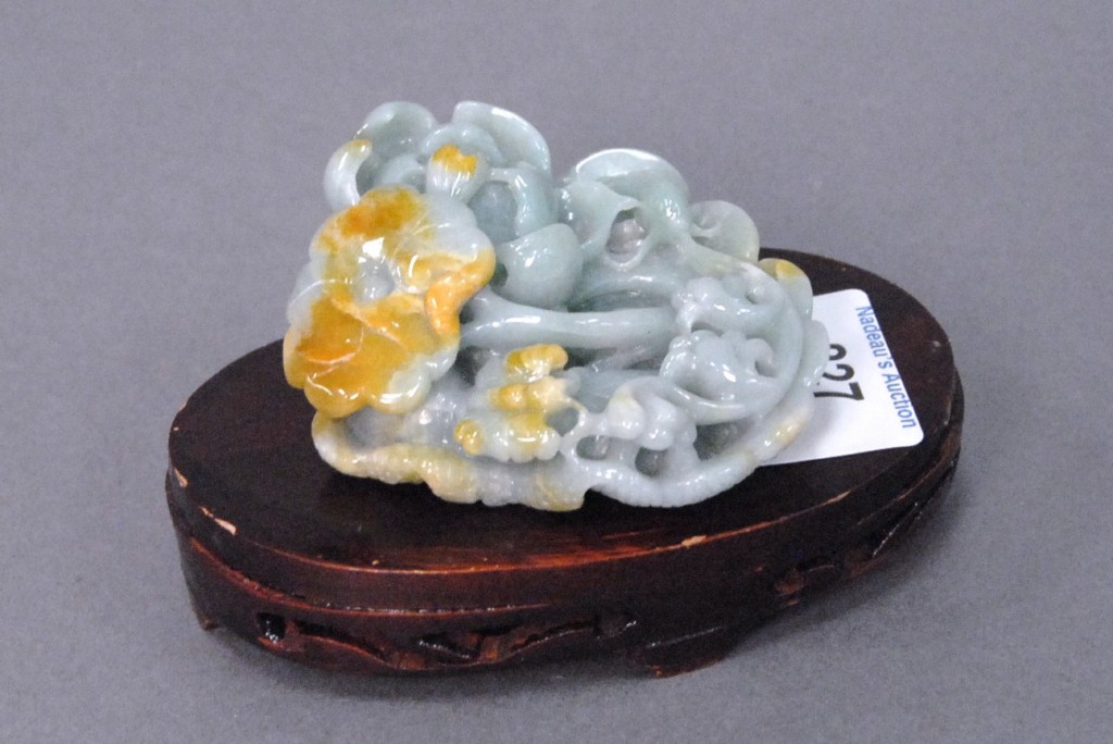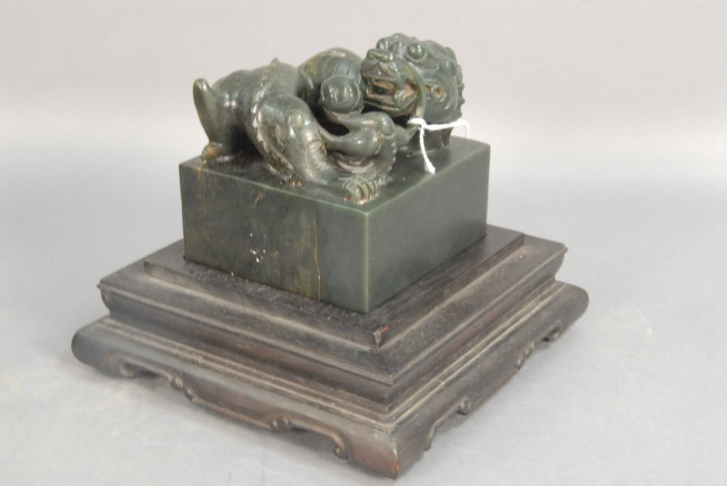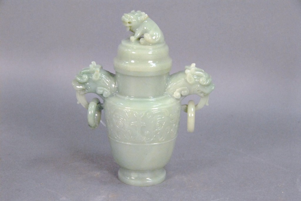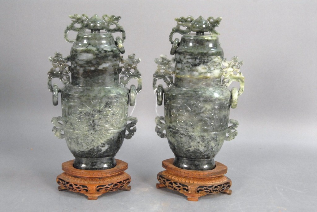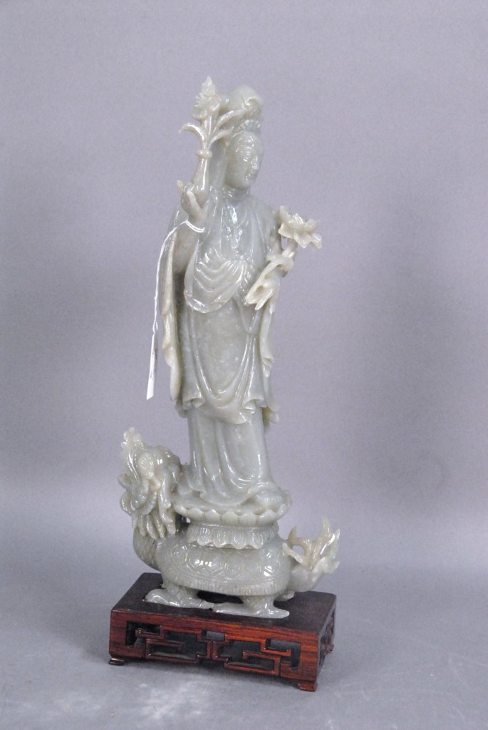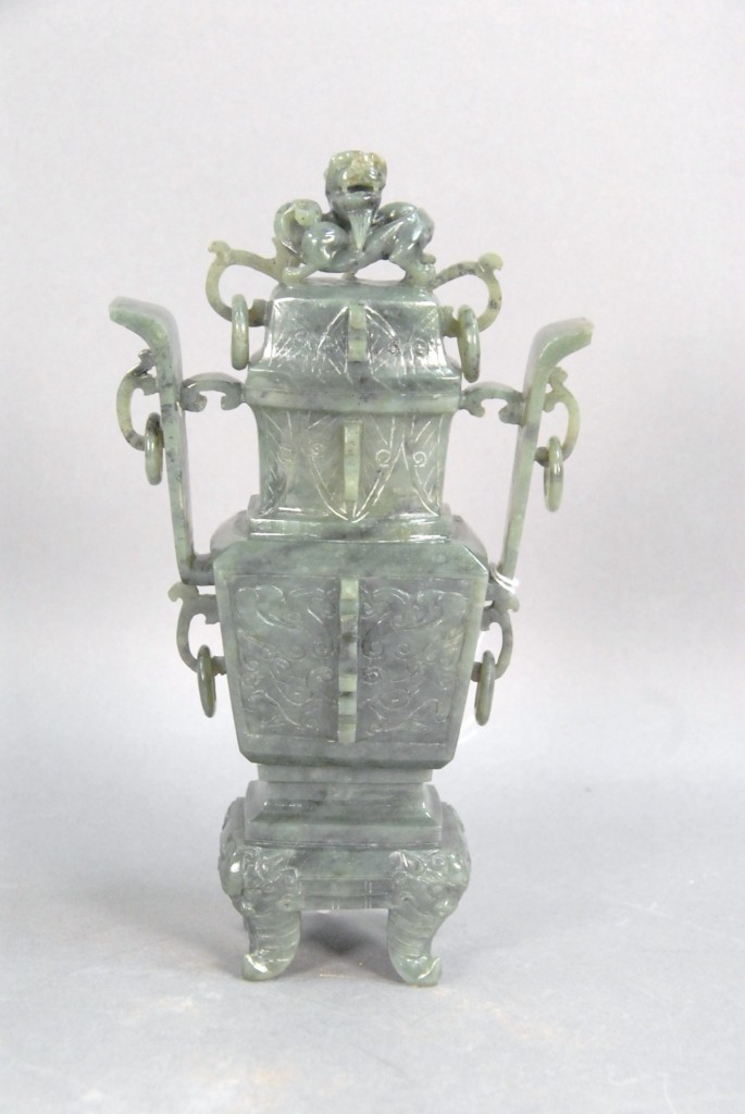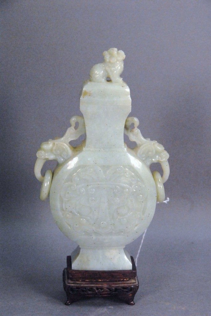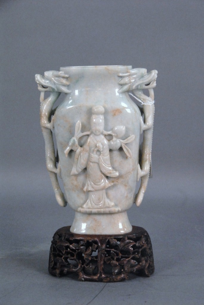 Celadon jade bronze form vase, flattened tapering vase, front carved in relief with a guanyin standing beside a small boy, and both holding a lotus stem, and on the reverse a guanyin holding a peach branch and a lingzhi carved in high relief form, the sides carved with undercut crawling dragon handles, along with a 2 stand, ht. of vase 8 1/2 no top. Provenance: Sold at Sotheby’s June 2 & 3, 1976, Chinese snuff bottles, jade, ceramics, and works of art, sale # 275 1200.