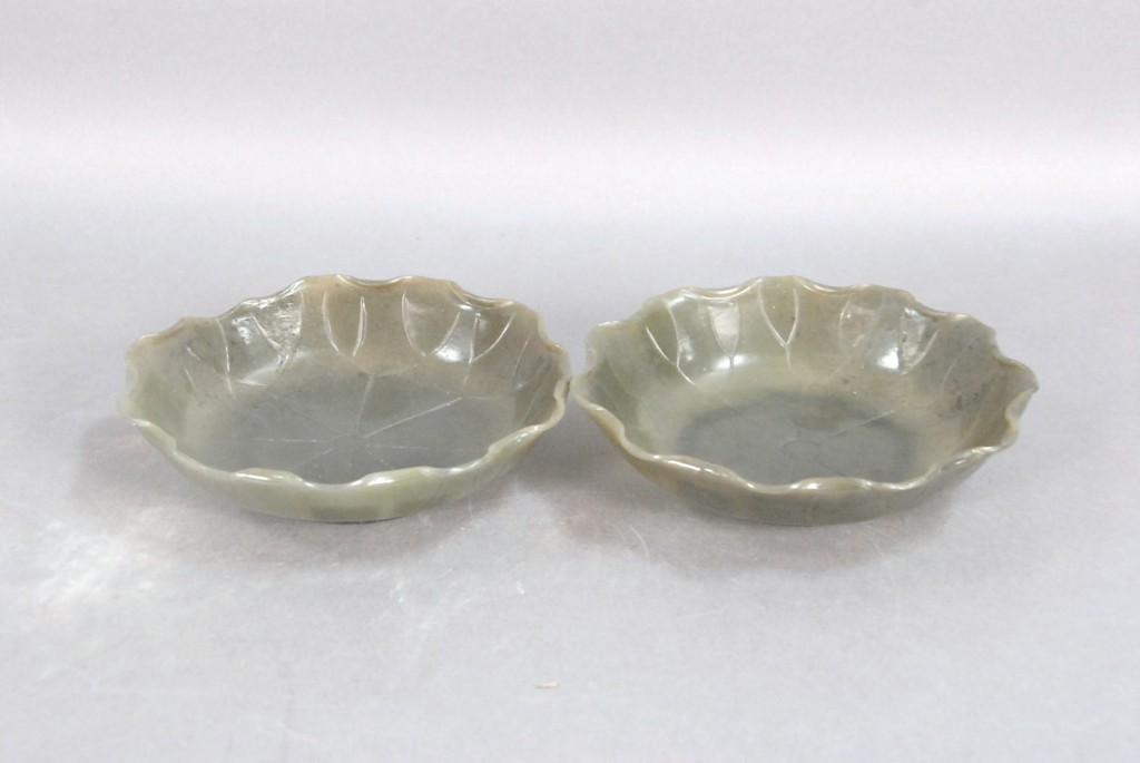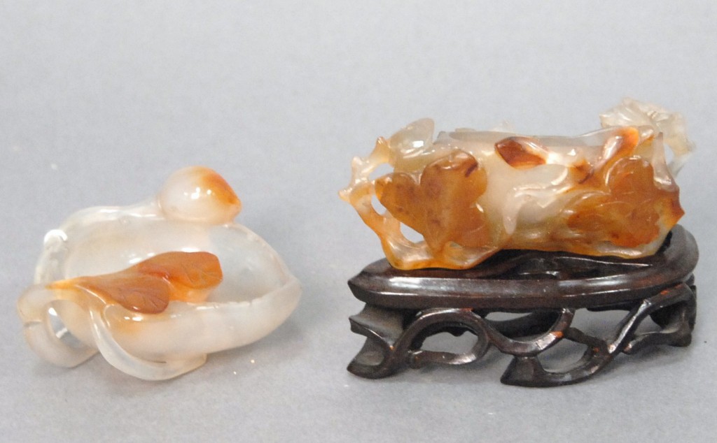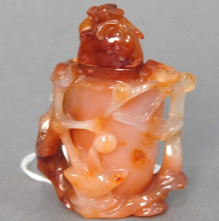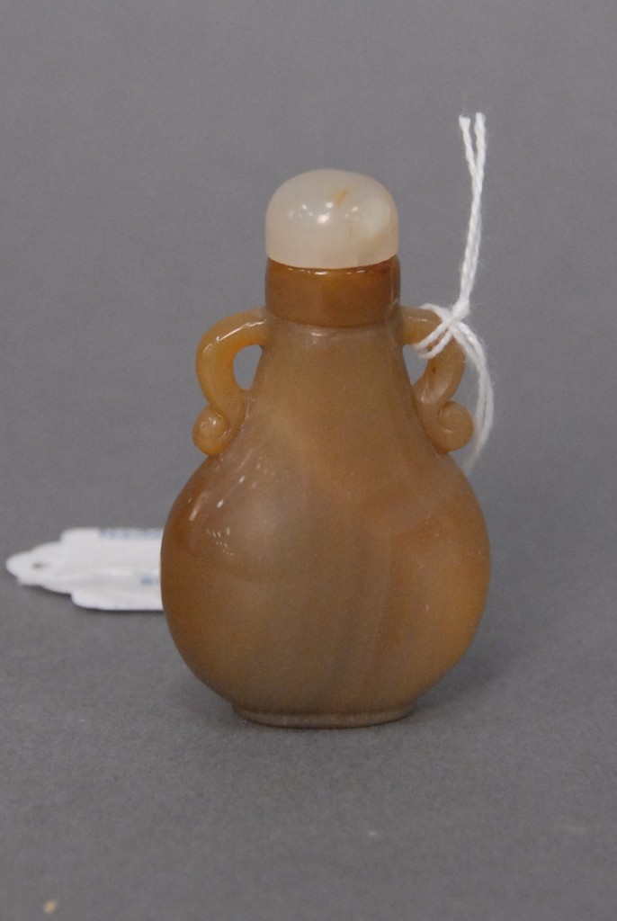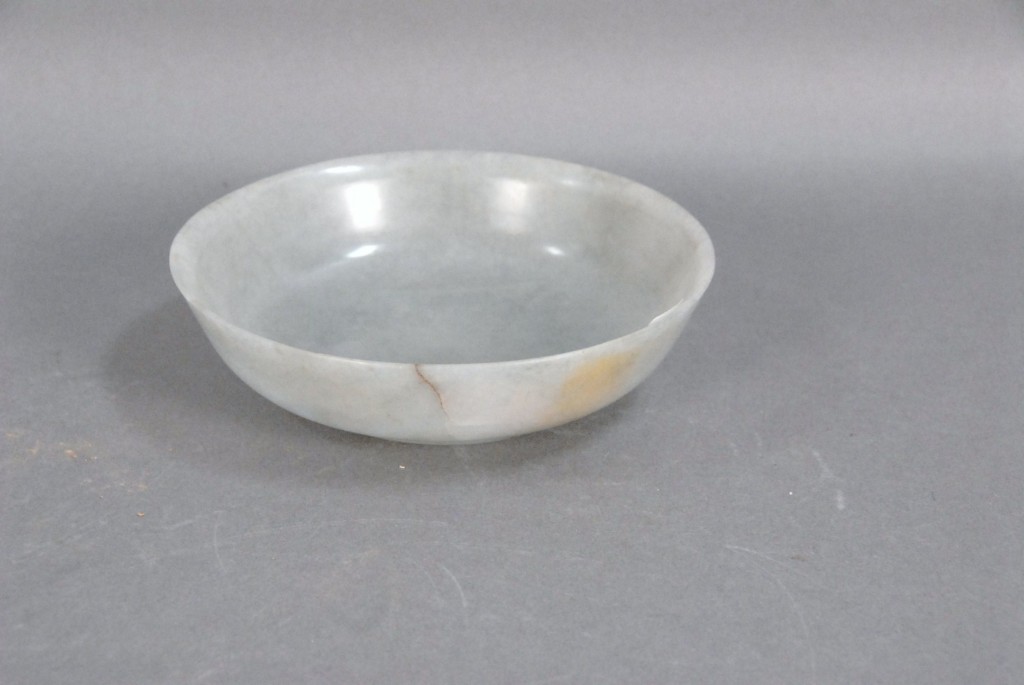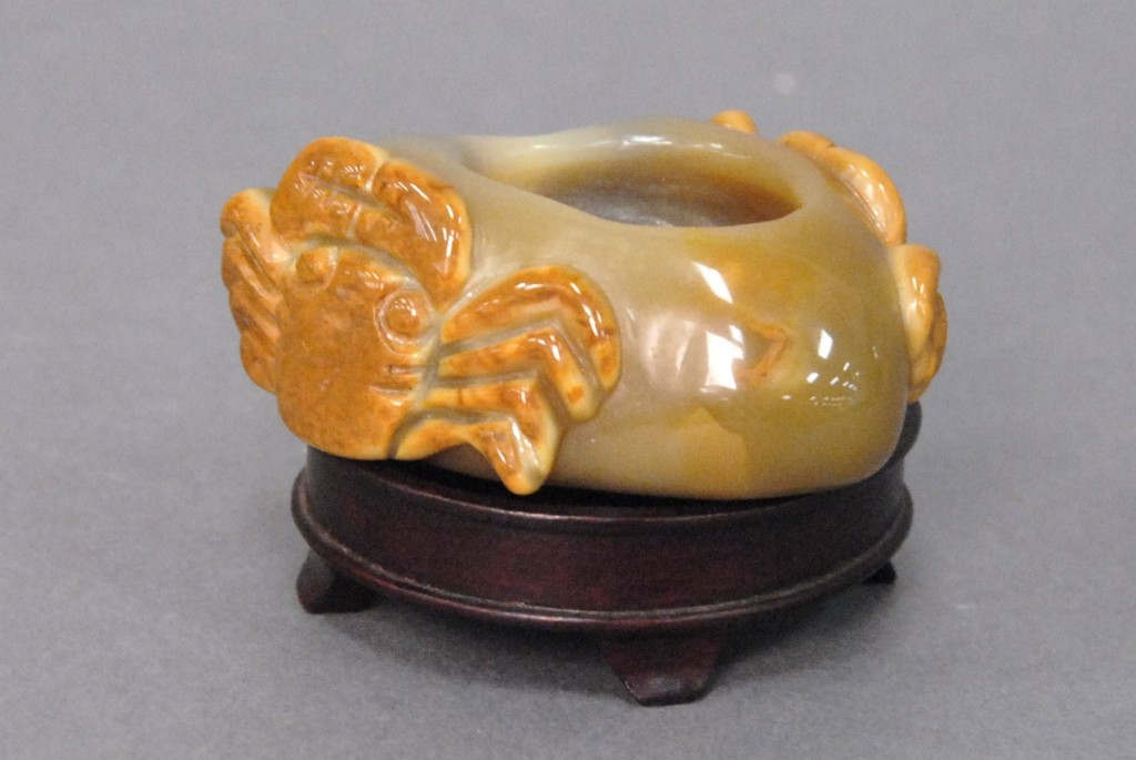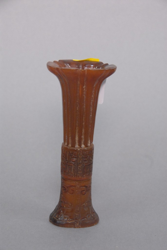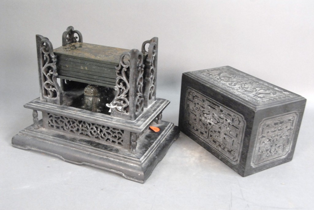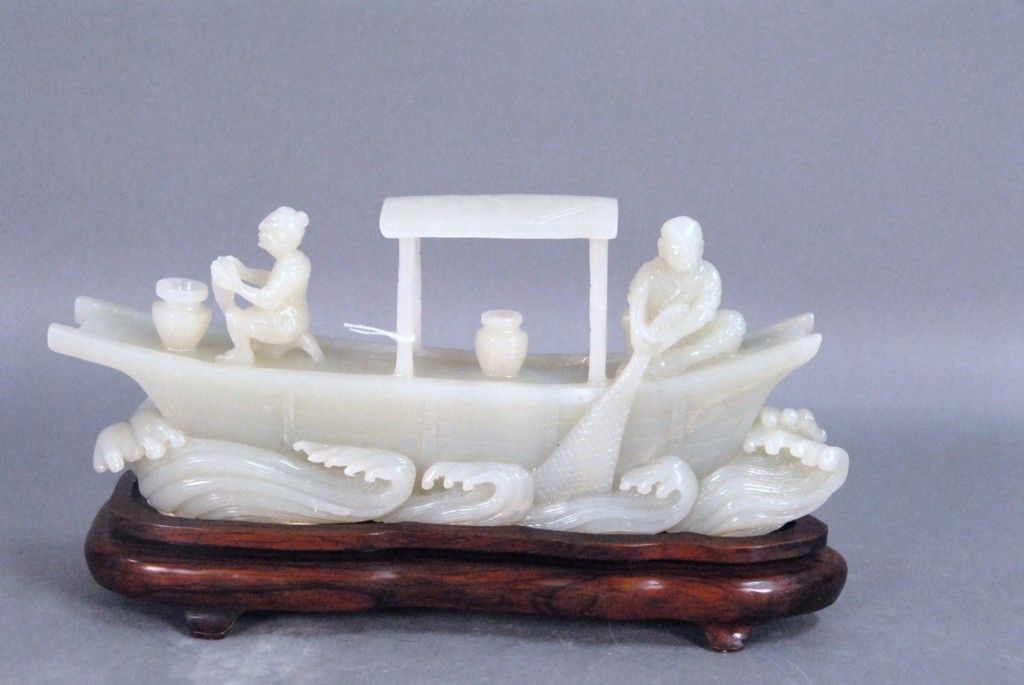 Celadon jade bronze form vase, flattened tapering vase, front carved in relief with a guanyin standing beside a small boy, and both holding a lotus stem, and on the reverse a guanyin holding a peach branch and a lingzhi carved in high relief form, the sides carved with undercut crawling dragon handles, along with a 2 stand, ht. of vase 8 1/2 no top. Provenance: Sold at Sotheby’s June 2 & 3, 1976, Chinese snuff bottles, jade, ceramics, and works of art, sale # 275 1200.
