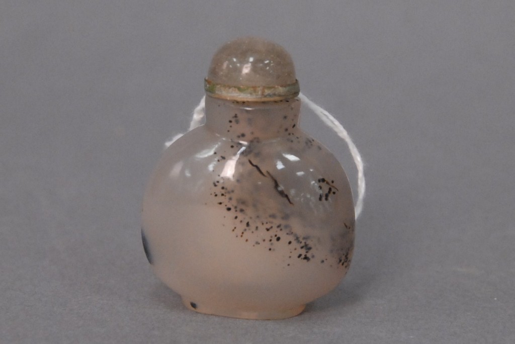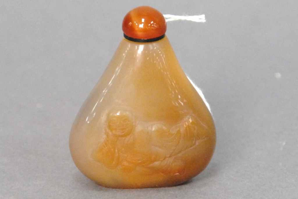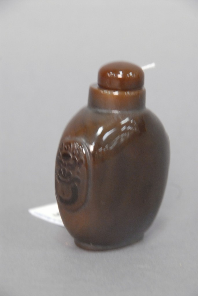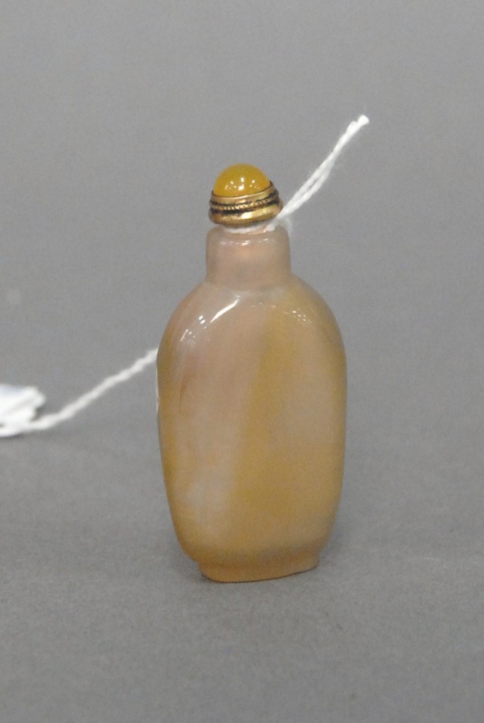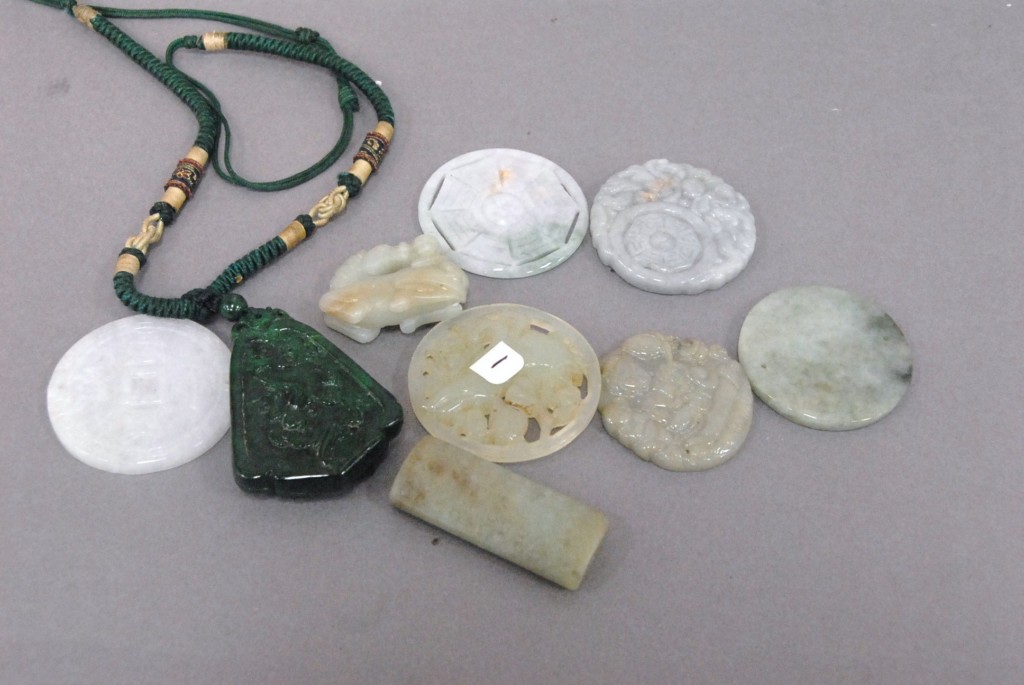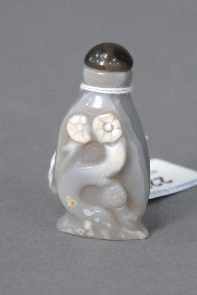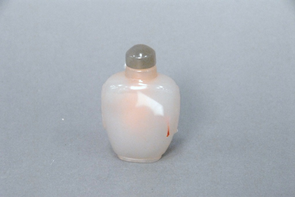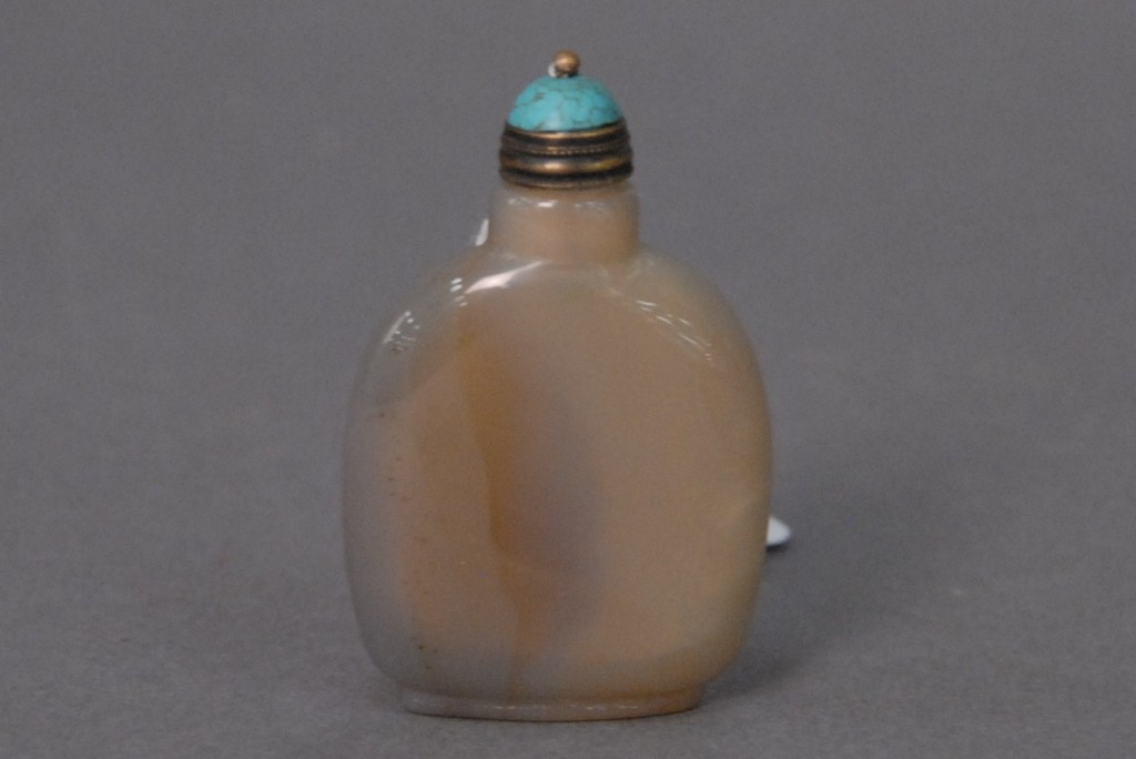 Celadon jade bronze form vase, flattened tapering vase, front carved in relief with a guanyin standing beside a small boy, and both holding a lotus stem, and on the reverse a guanyin holding a peach branch and a lingzhi carved in high relief form, the sides carved with undercut crawling dragon handles, along with a 2 stand, ht. of vase 8 1/2 no top. Provenance: Sold at Sotheby’s June 2 & 3, 1976, Chinese snuff bottles, jade, ceramics, and works of art, sale # 275 1200.