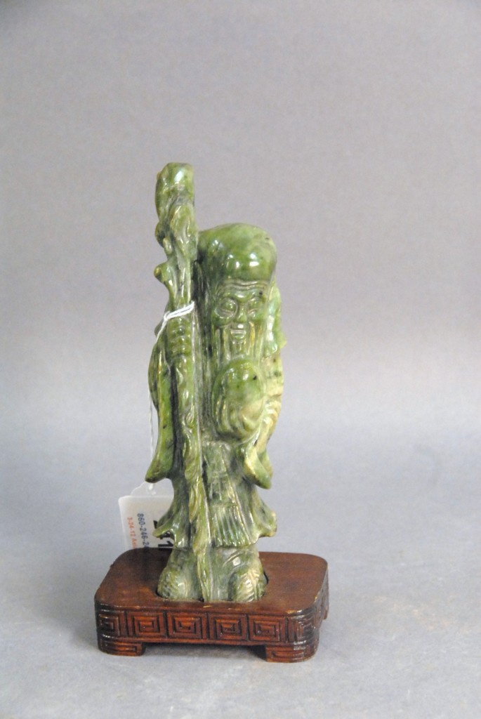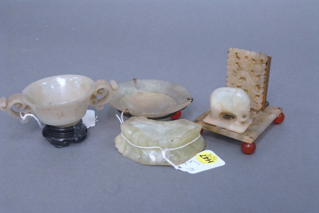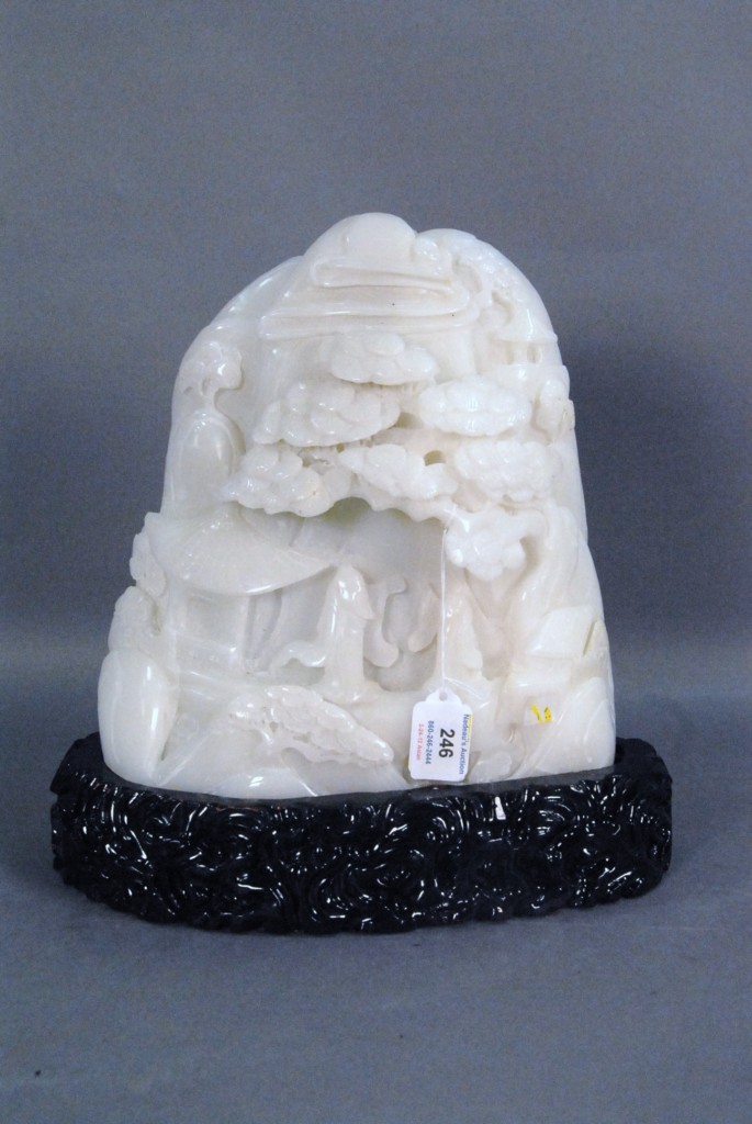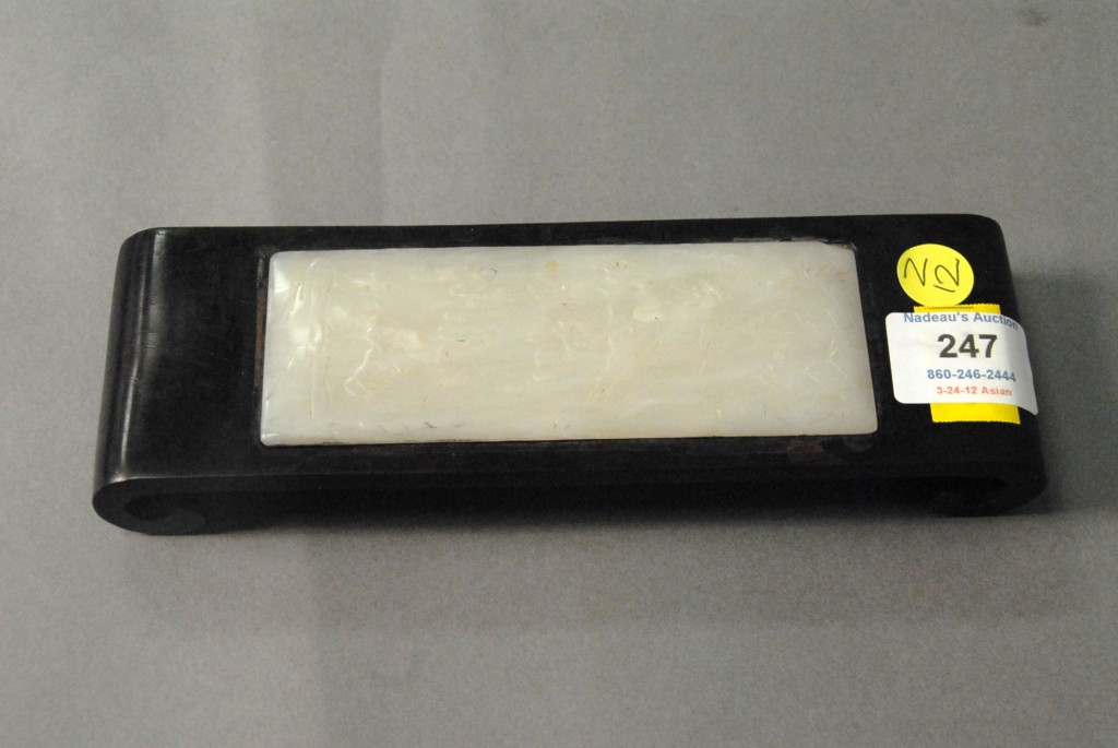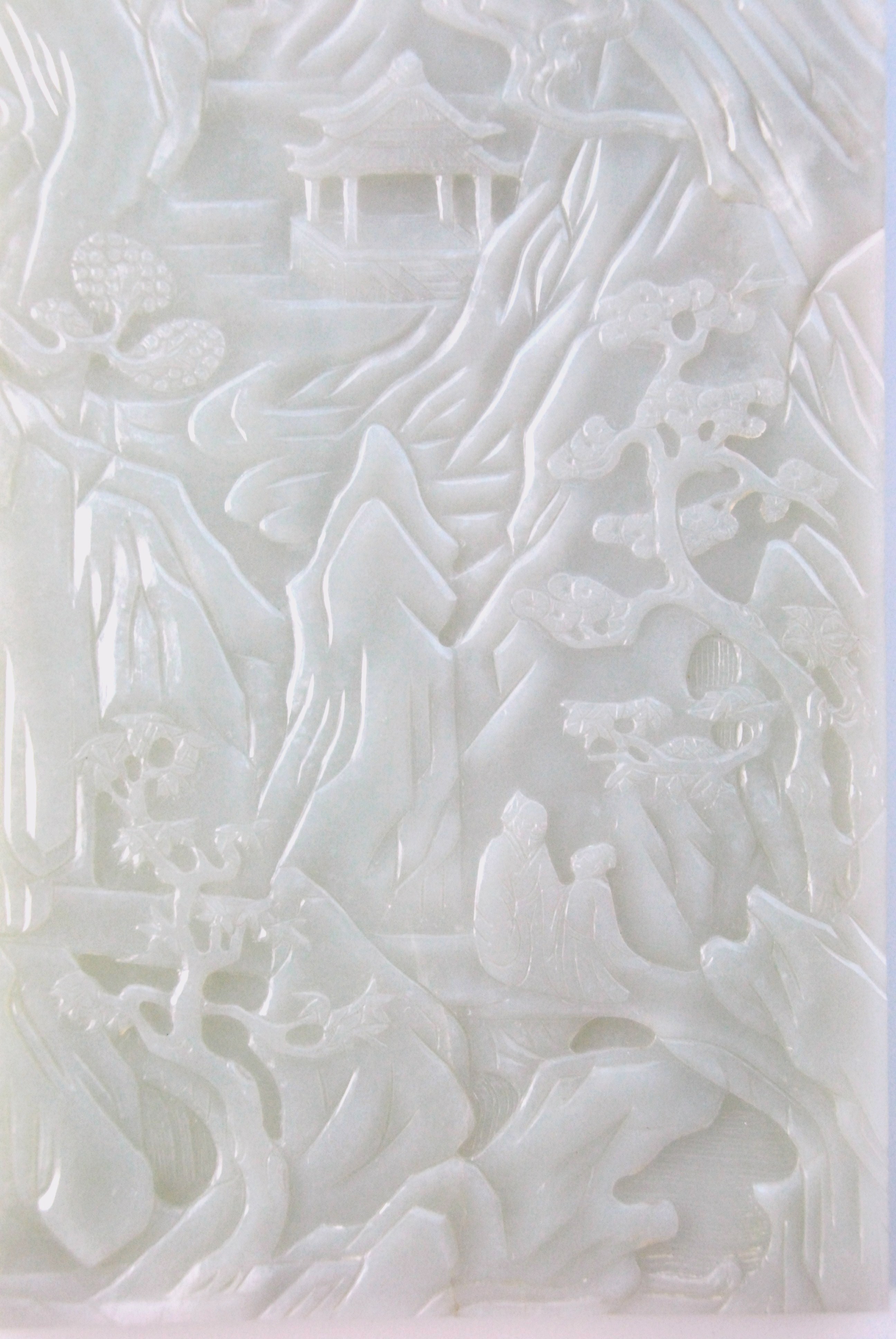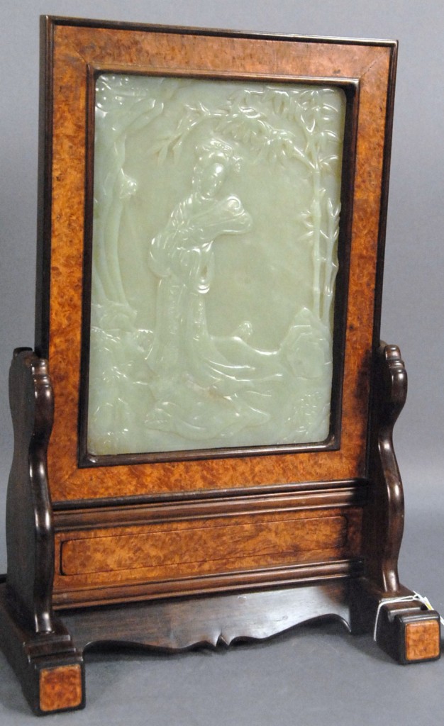 White to light green jade table screen, rectangle upright panel, exquisitely carved in relief mountainous landscape depicting two sages conversing on a narrow bridge over a stream, the reverse having two cranes, bats, flowering branches and a pine, along with a wood stand, jade: 10 3/8 x 7, probably 19th century. Provenance: Sold by Sotheby’s March 18 & 19, 1977, from Mr. and Mrs. Henry J. Heinz II Collection, paid 3200, comes with the 1977 catalog, total height 14 1/2.