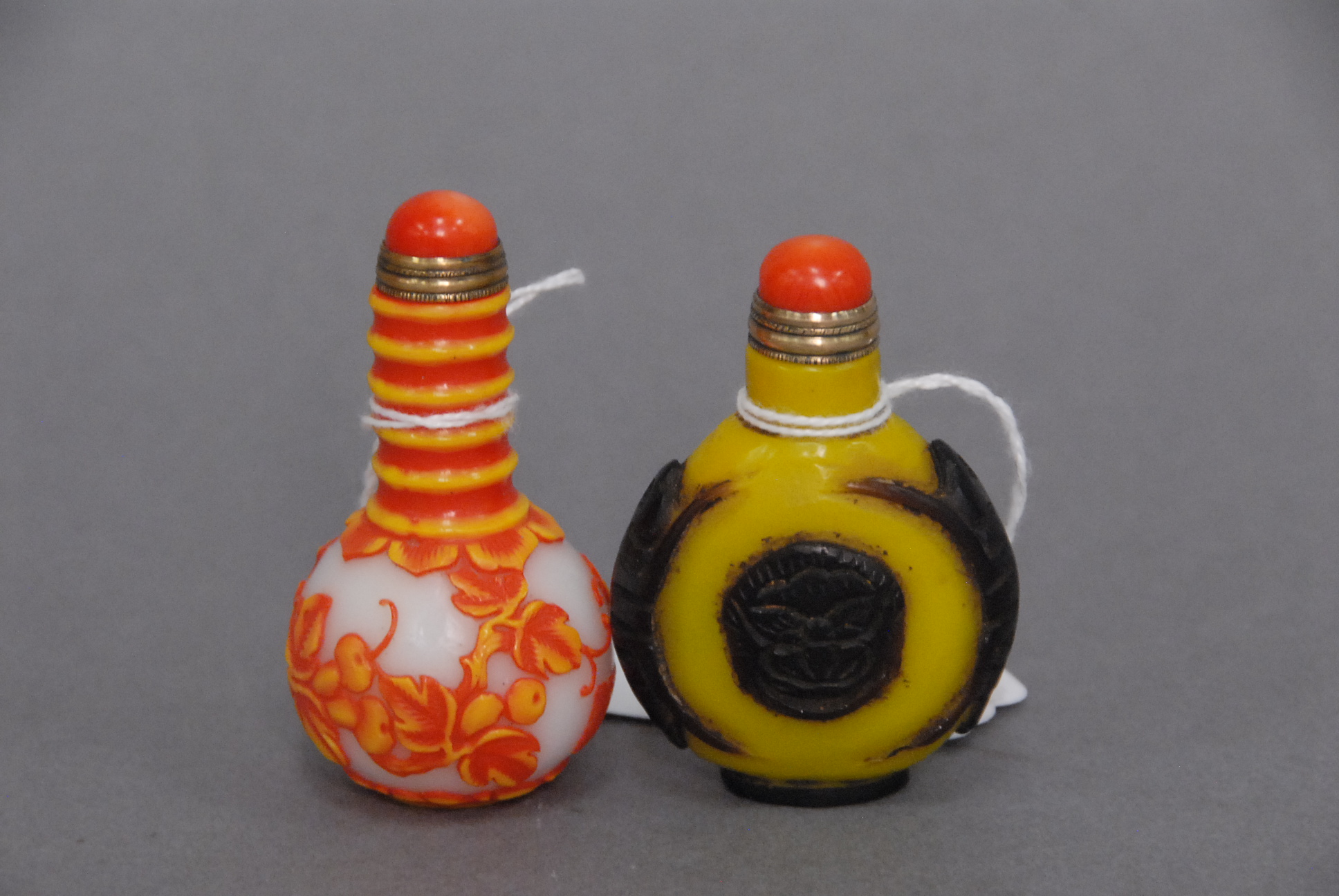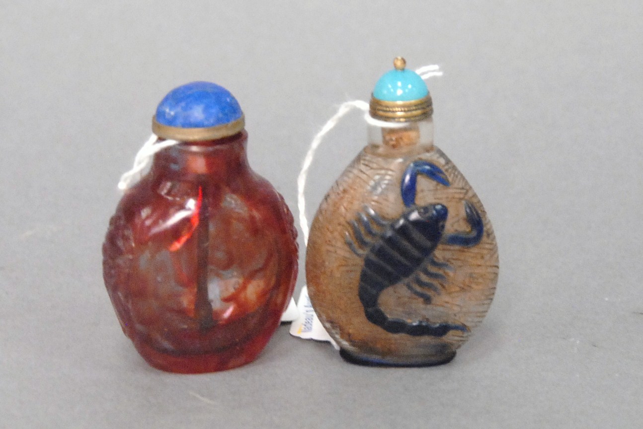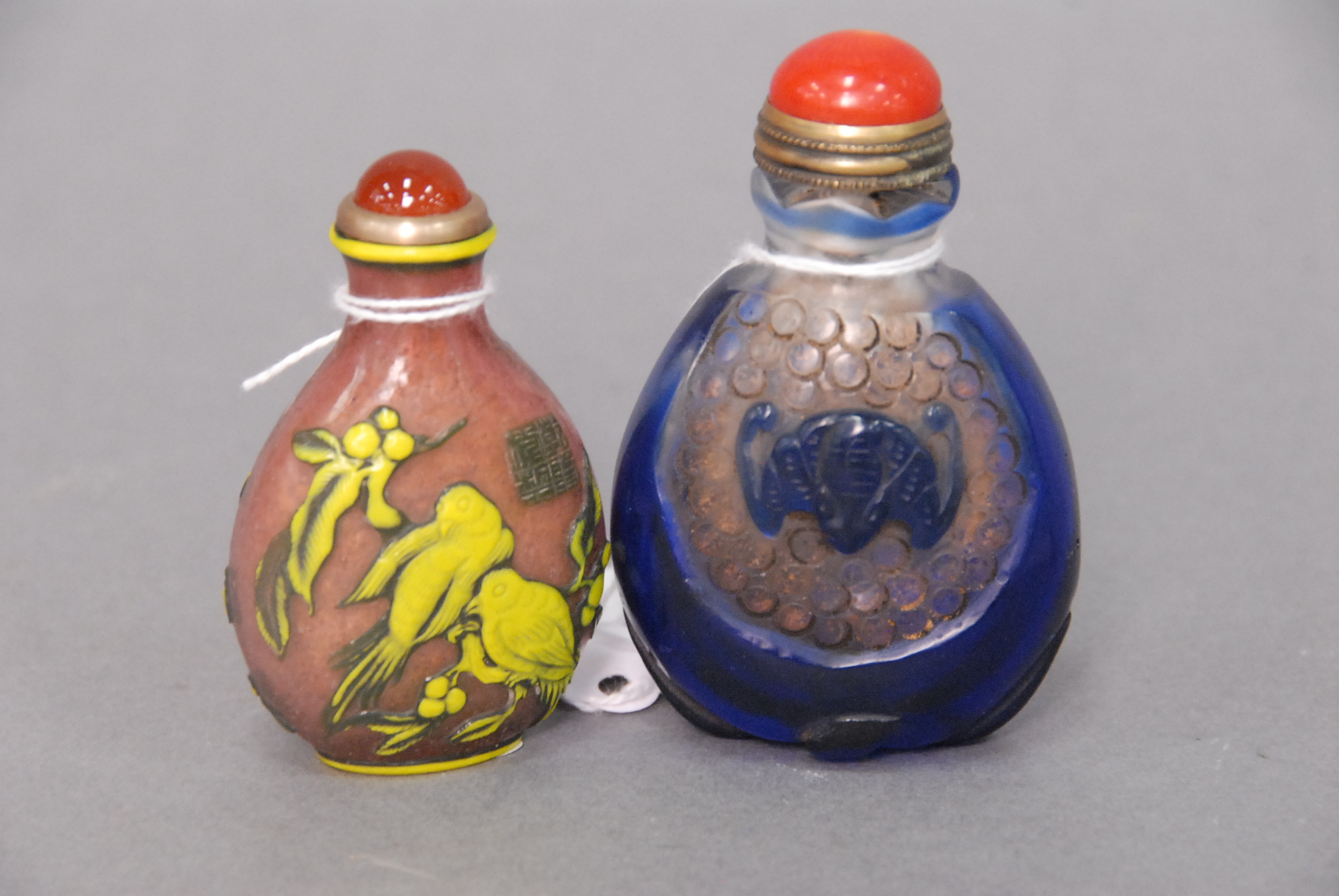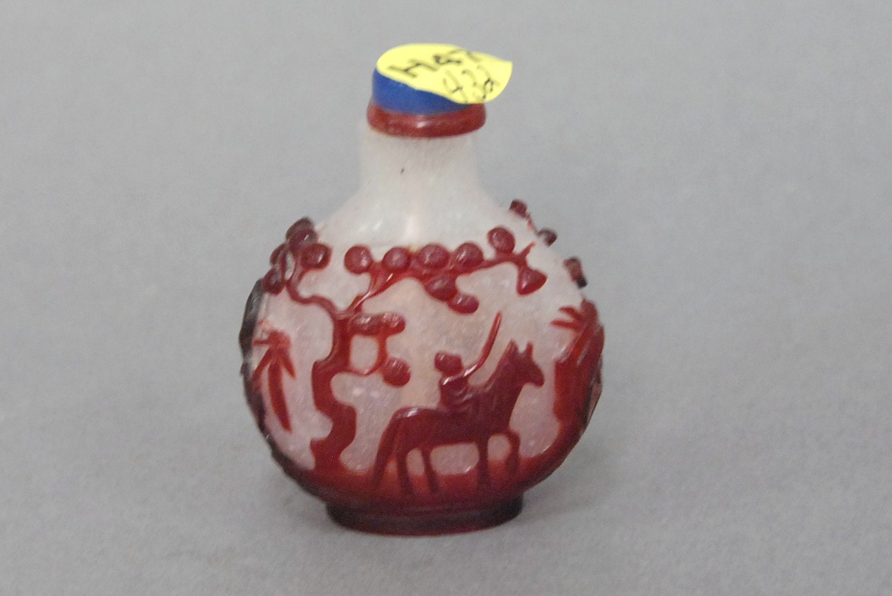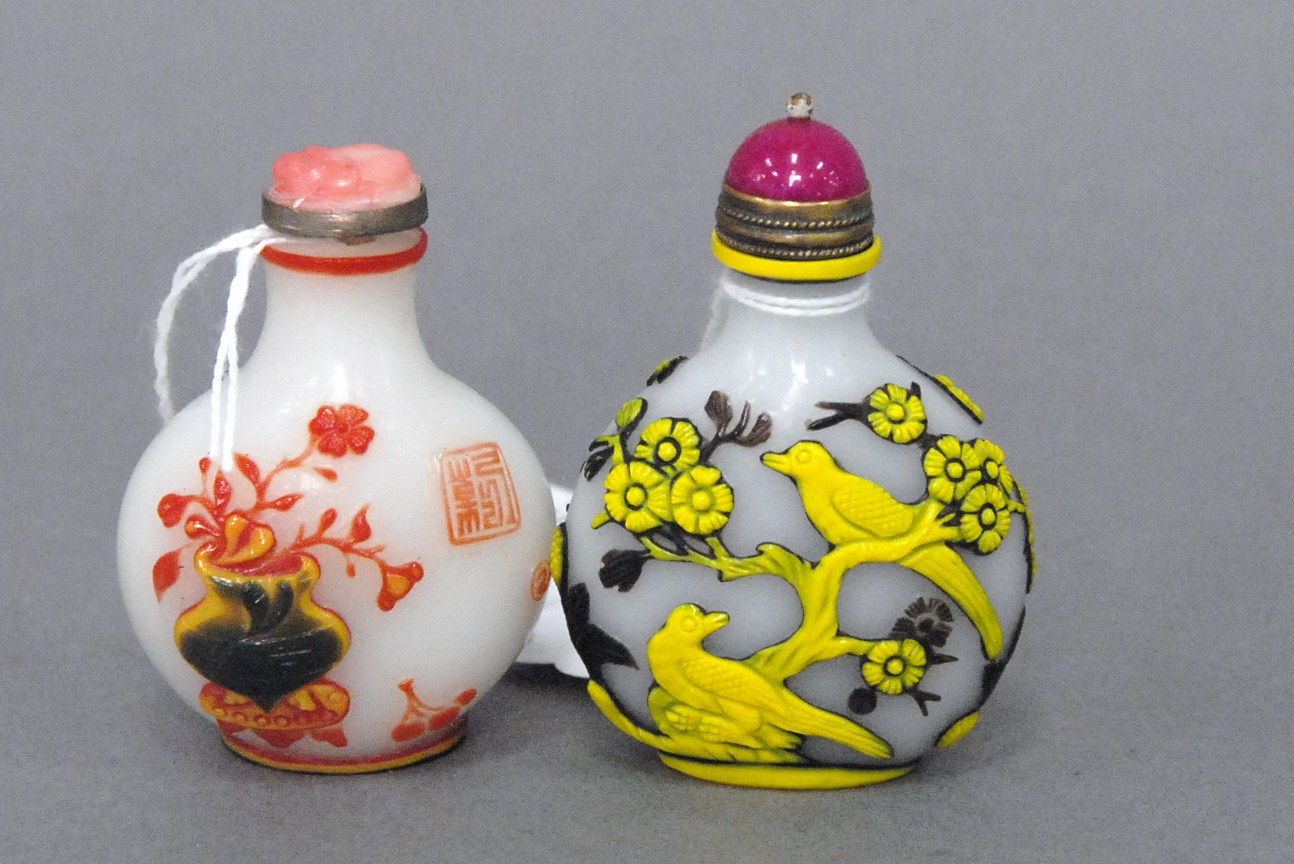 Two snuff bottles milk glass snuff bottle green, yellow and red glass overlay signed Qing Dynasty with pink glass top, ht 2 1/2 and carved milk glass snuff bottle with two color glass overlay of brown and yellow tree branches, birds, blossoming flowers and a squirrel, having red glass top, ht 2 3/4.