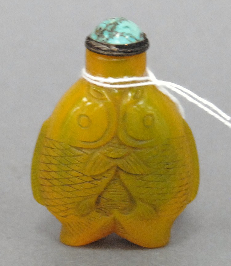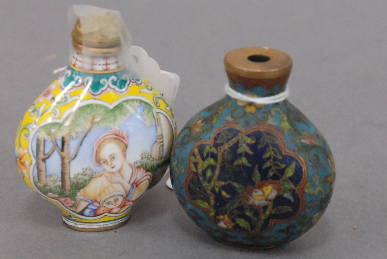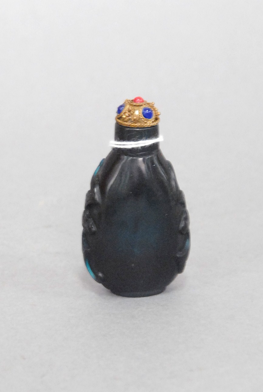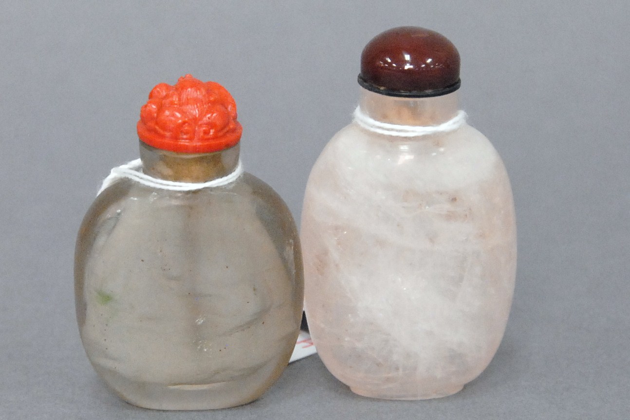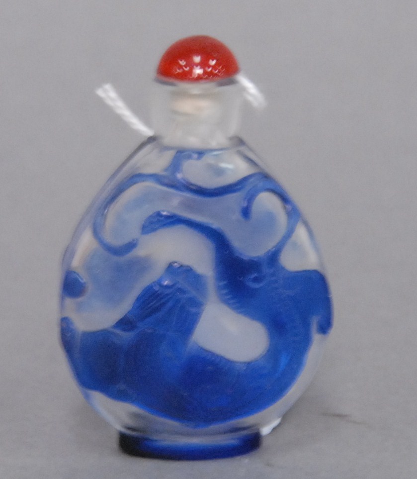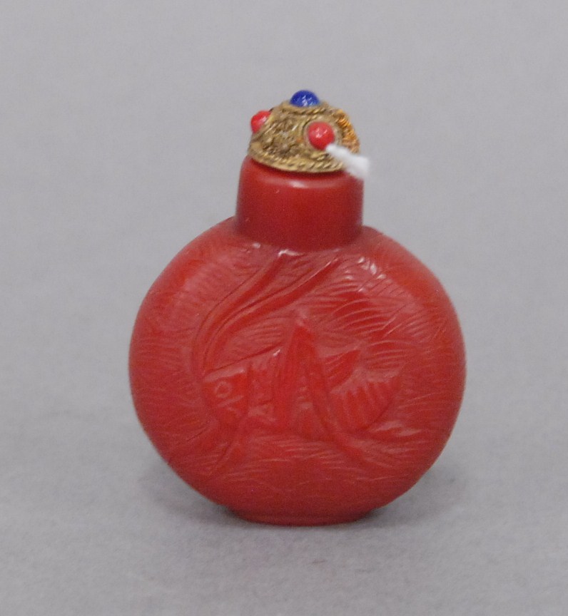 Two snuff bottles milk glass snuff bottle green, yellow and red glass overlay signed Qing Dynasty with pink glass top, ht 2 1/2 and carved milk glass snuff bottle with two color glass overlay of brown and yellow tree branches, birds, blossoming flowers and a squirrel, having red glass top, ht 2 3/4.