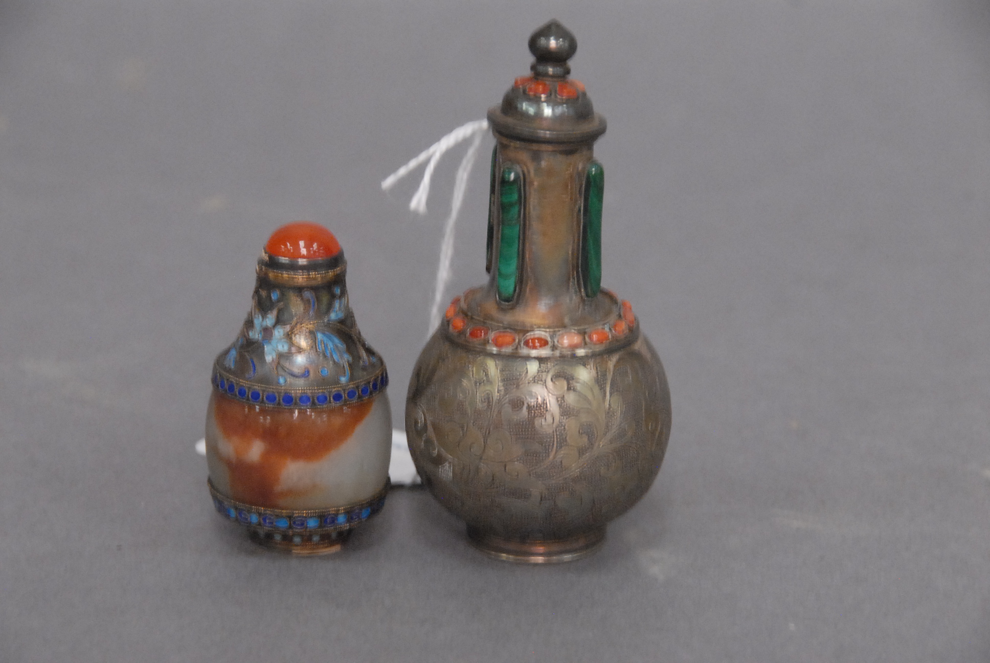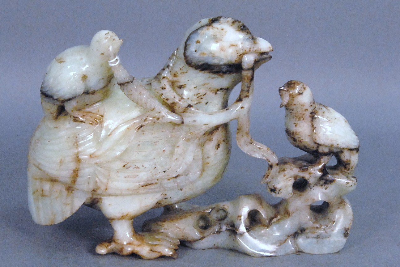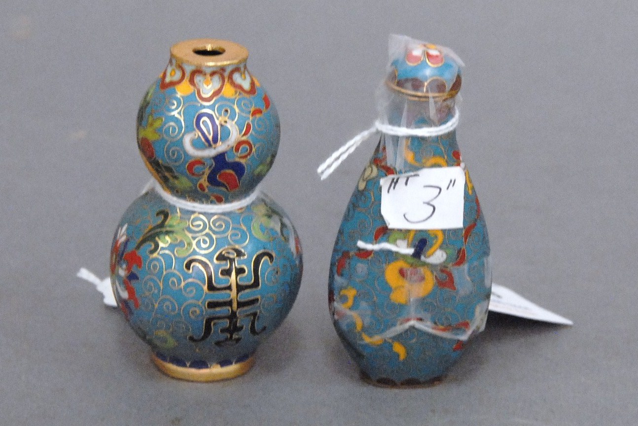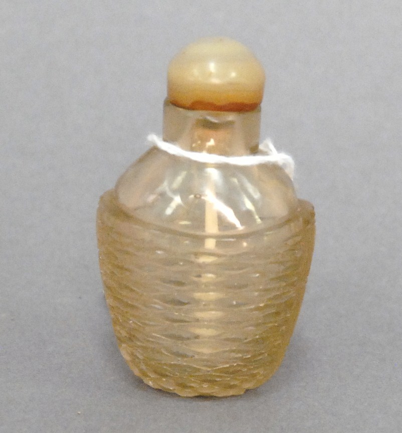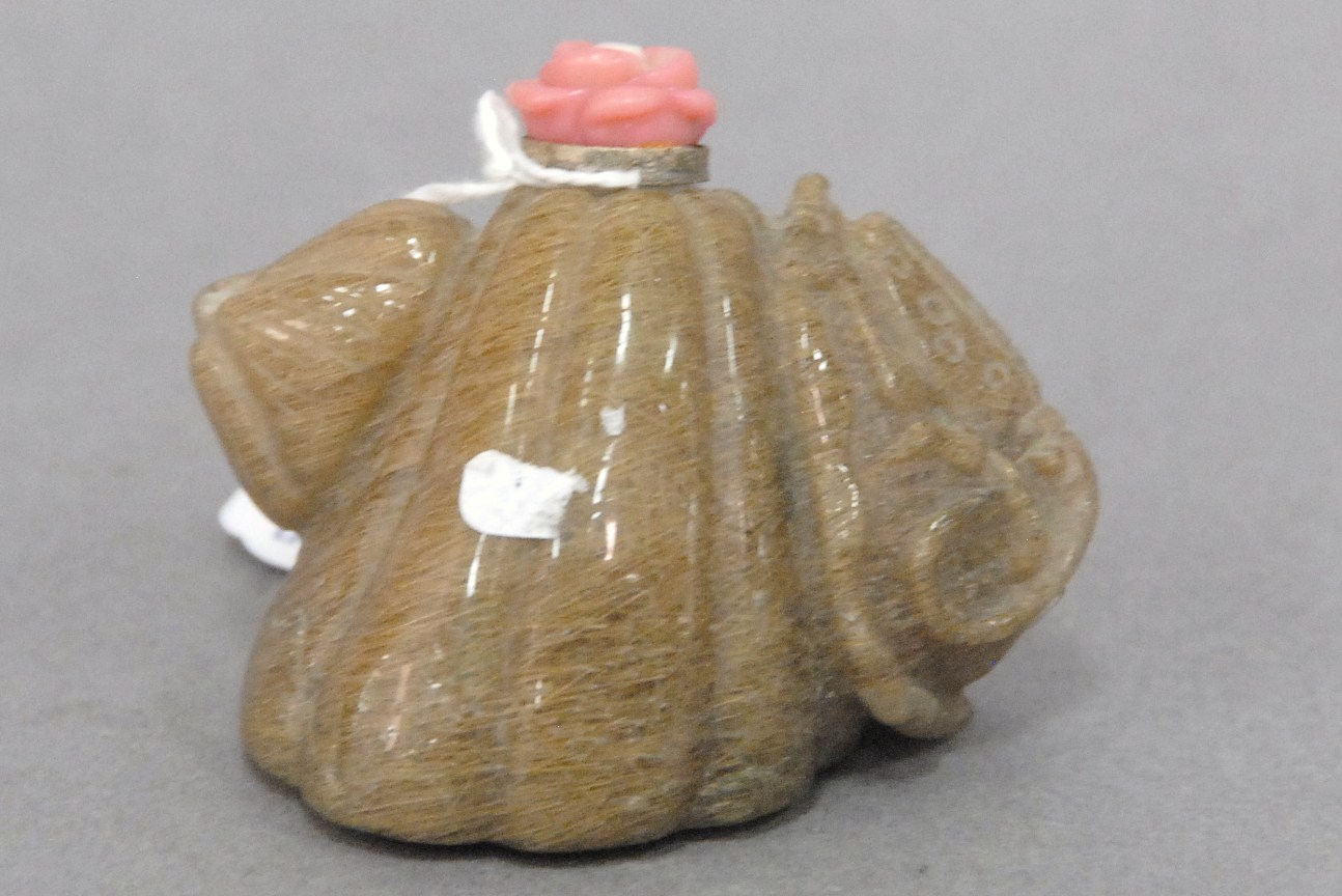 Two snuff bottles milk glass snuff bottle green, yellow and red glass overlay signed Qing Dynasty with pink glass top, ht 2 1/2 and carved milk glass snuff bottle with two color glass overlay of brown and yellow tree branches, birds, blossoming flowers and a squirrel, having red glass top, ht 2 3/4.