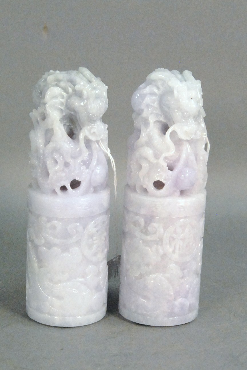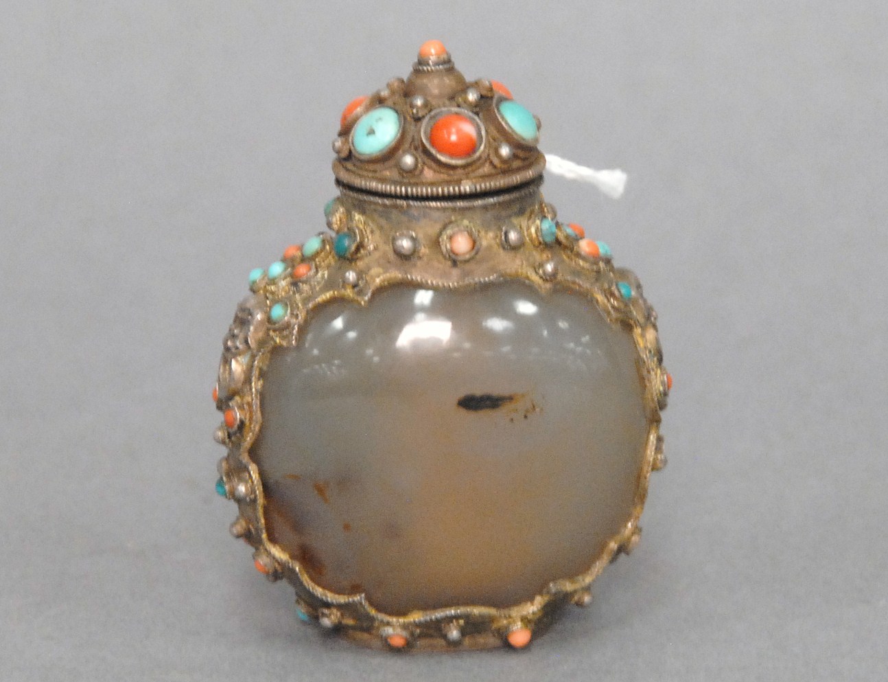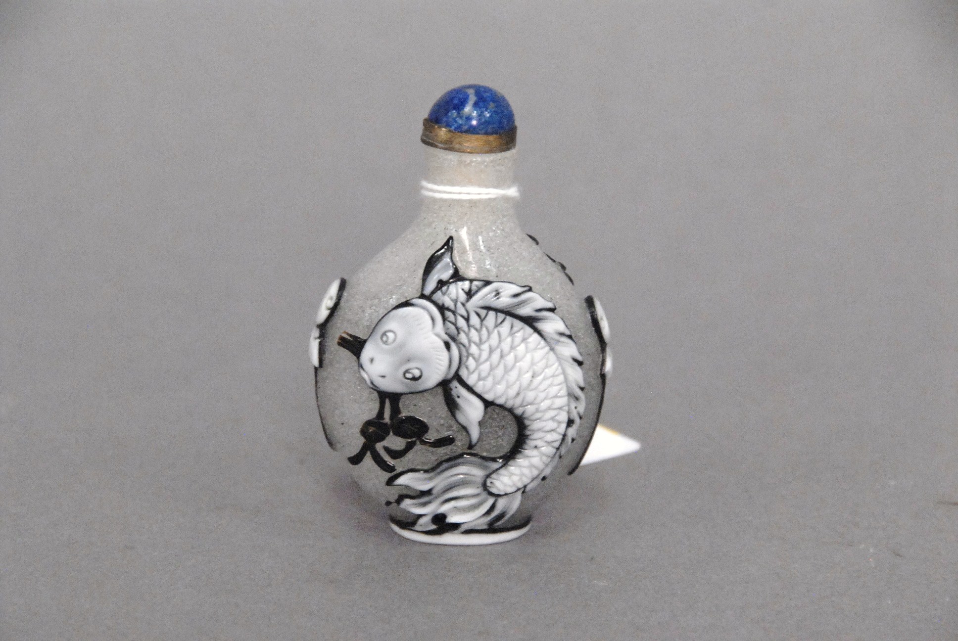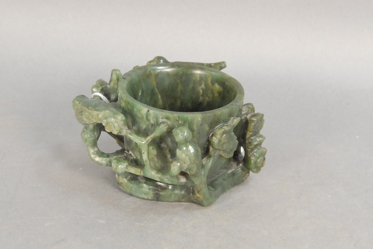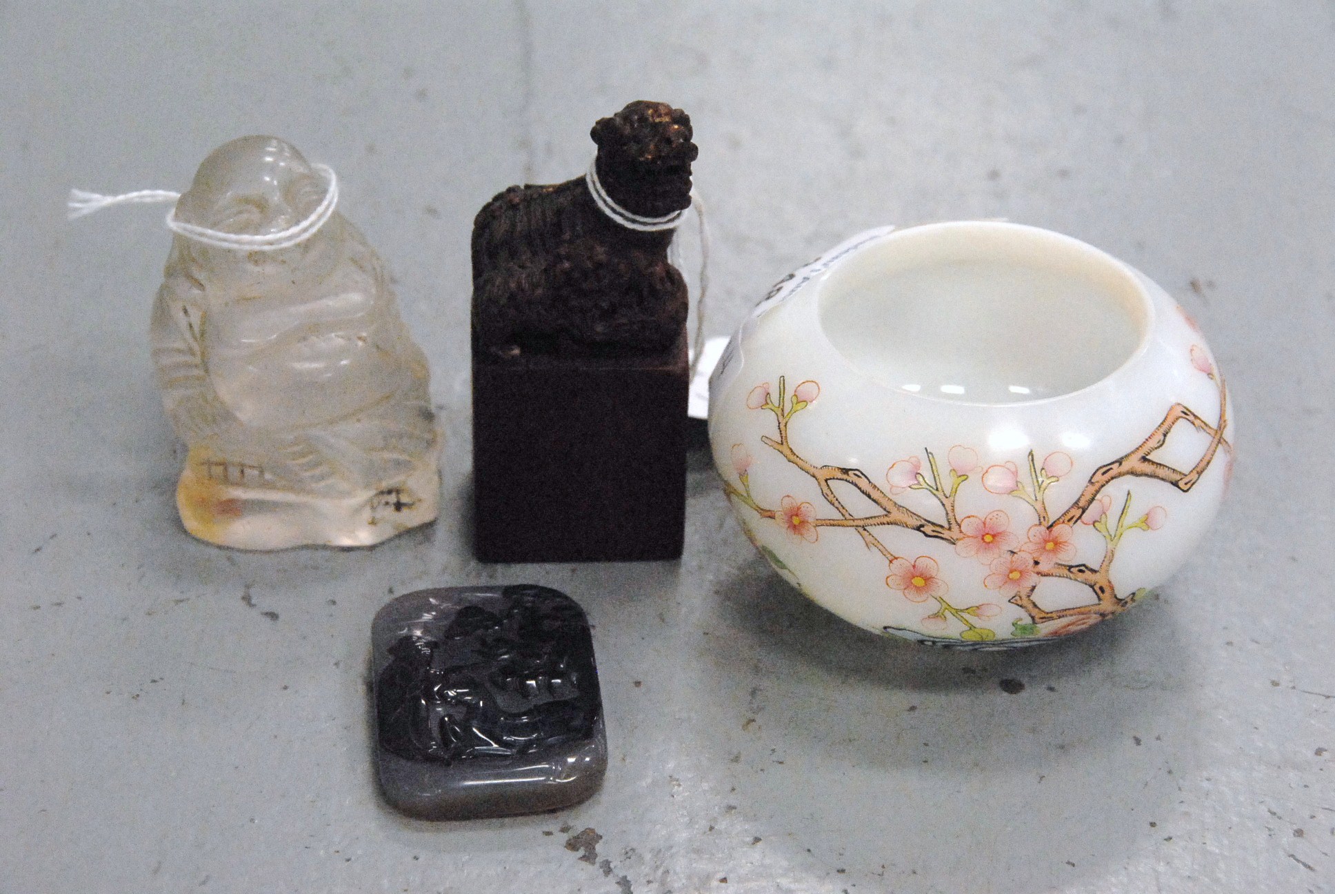 Two snuff bottles milk glass snuff bottle green, yellow and red glass overlay signed Qing Dynasty with pink glass top, ht 2 1/2 and carved milk glass snuff bottle with two color glass overlay of brown and yellow tree branches, birds, blossoming flowers and a squirrel, having red glass top, ht 2 3/4.