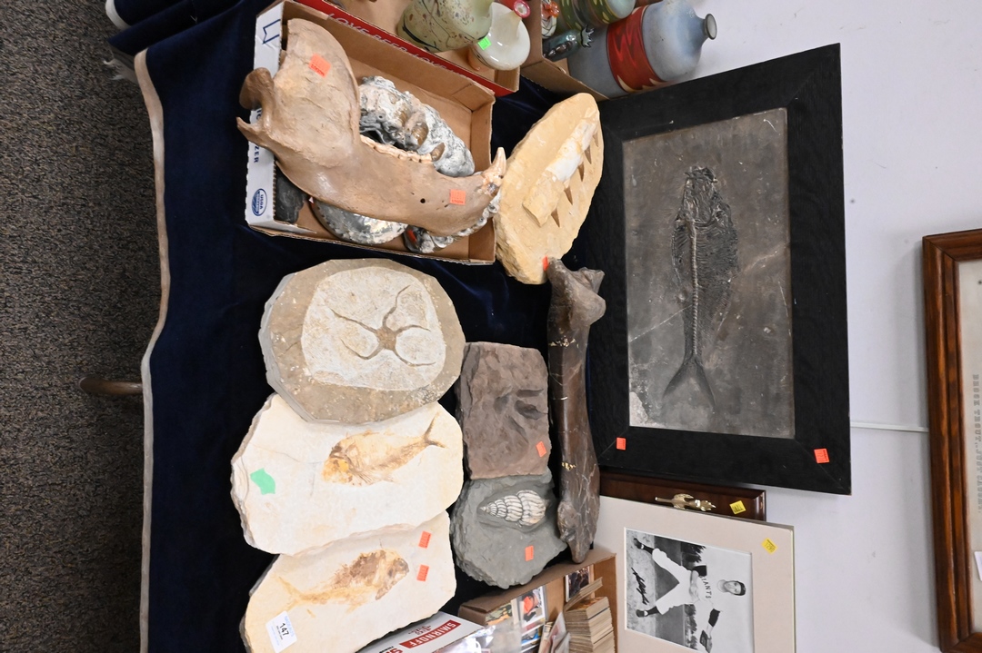 Group of Assorted Fossils and Specimens, to include cave bear jaw and teeth, fish fossils, shell, femur bone, etc. Provenance: Estate of Peter Tillou, Litchfield, Connecticut.