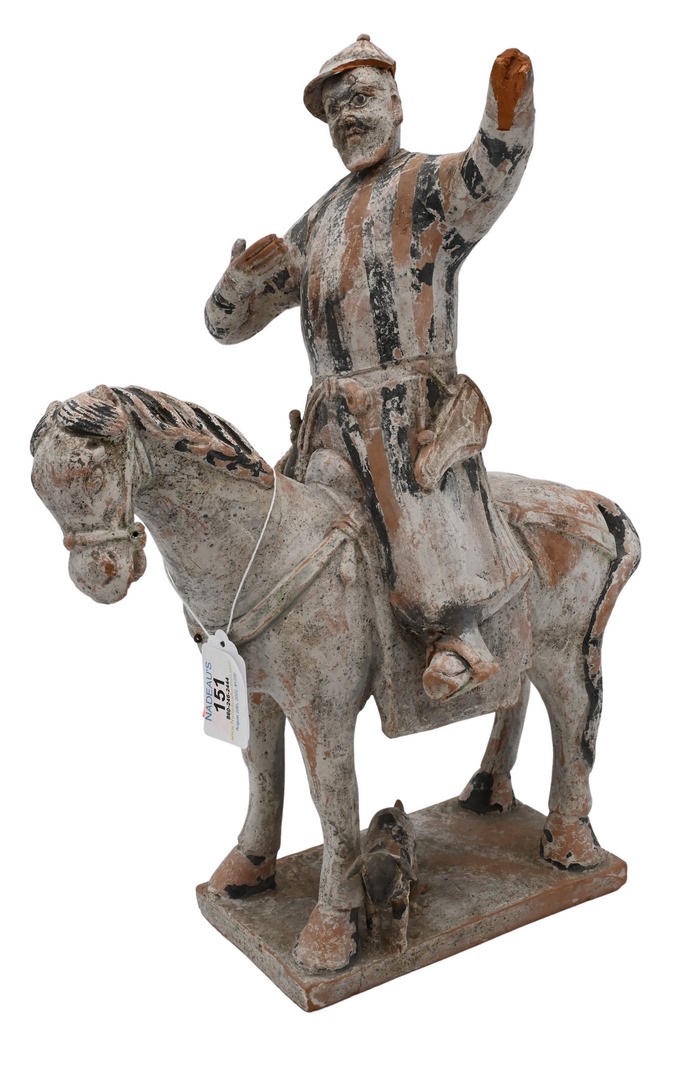 Chinese Tomb-Style Painted Pottery Figure on Horseback, on square base, repaired, height 15 inches. Provenance: Estate of Peter Tillou, Litchfield, Connecticut.