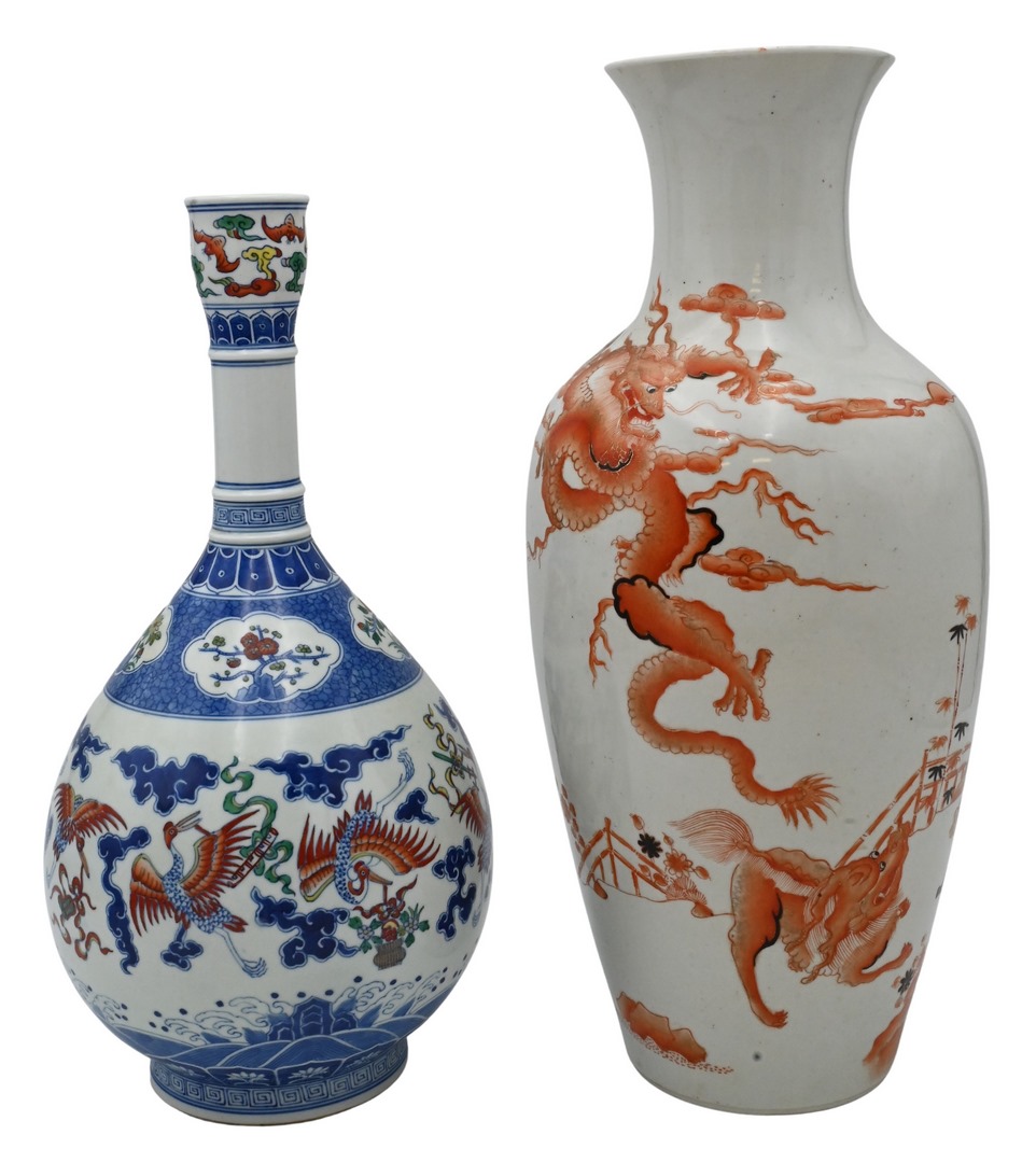 Two Chinese Porcelain Vases, to include an orange and red dragon vase, height 15 1/2 inches; along with a blue, red, and white bottle vase, height 13 3/4 inches.