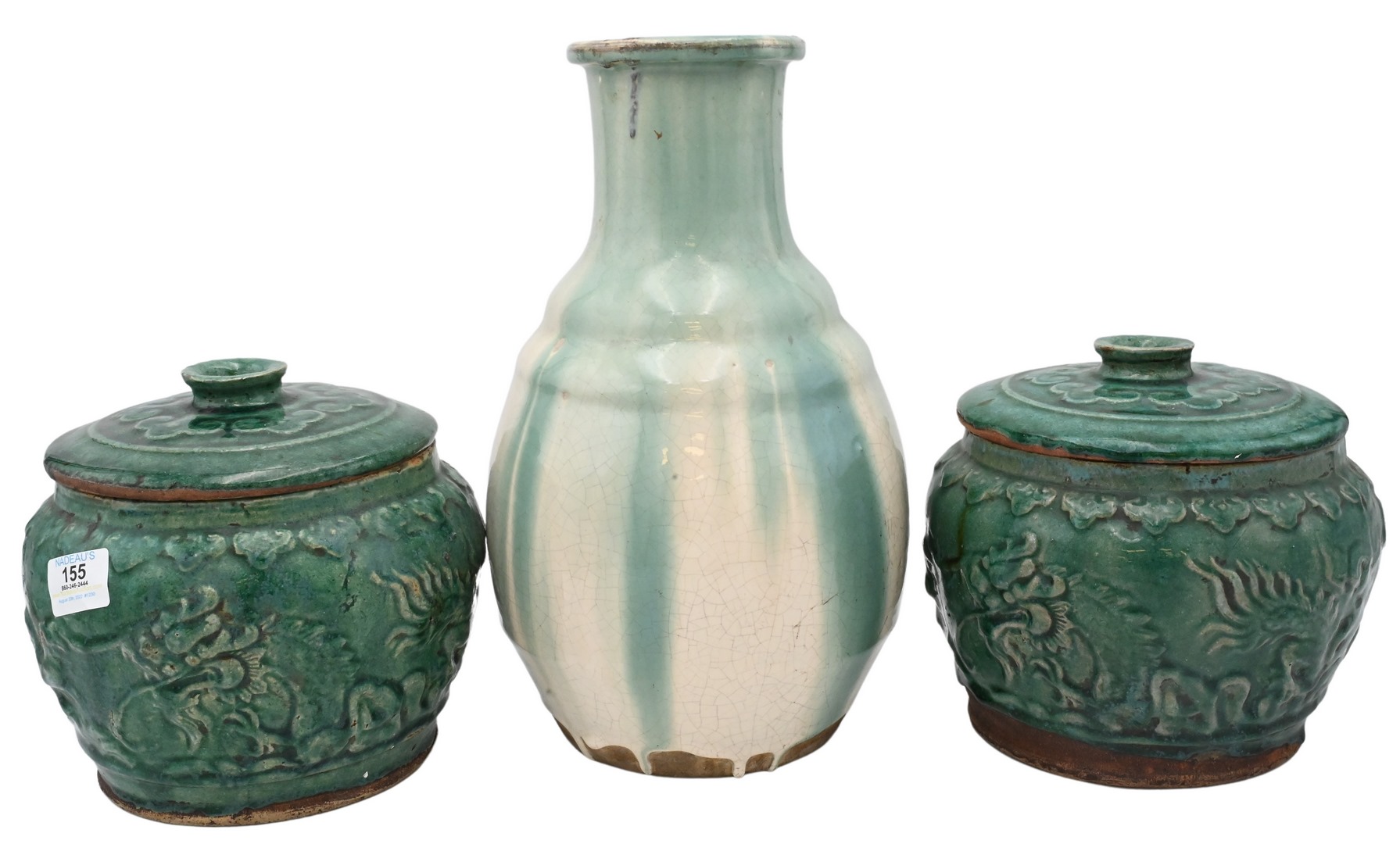 Three Piece Group of Glazed Stoneware, to include a pair of green covered pots with flowers, animals and dragons; along with a green and white glazed vase, tallest 13 inches. Provenance: Estate of Peter Tillou, Litchfield, Connecticut.