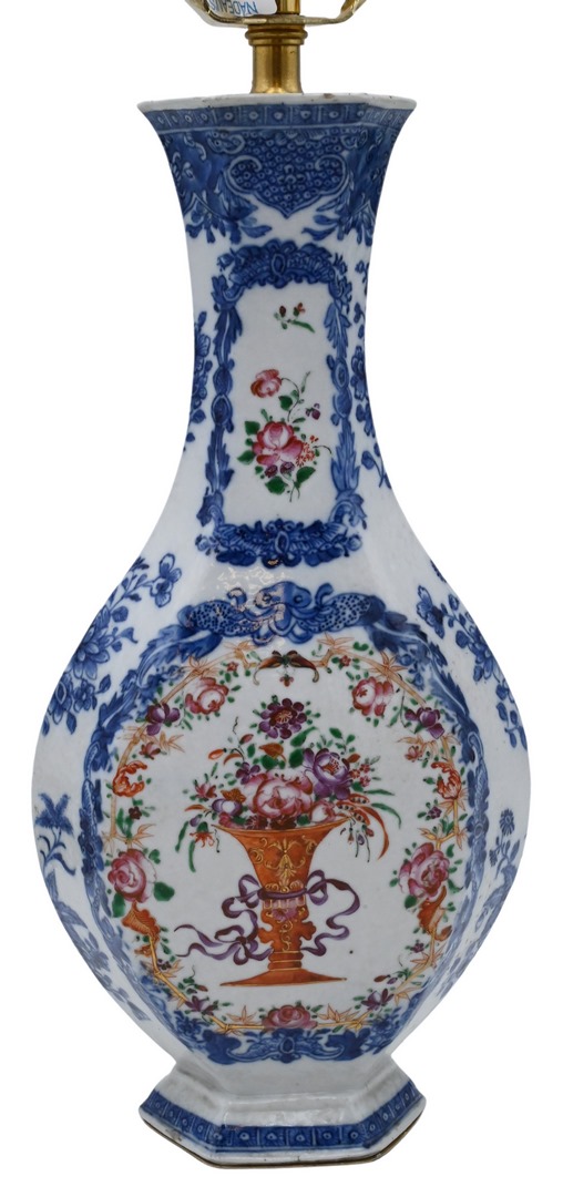 Chinese Blue and White Porcelain Vase, each side painted with flowers, vase height 11 1/2 inches, total height 22 inches. Provenance: Estate of Peter Tillou, Litchfield, Connecticut.