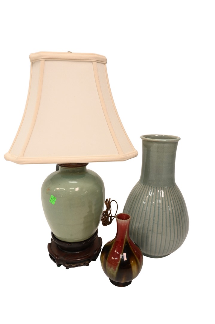 Three Piece Group of Asian Porcelain, to include a Chinese celadon glazed vase made into a table lamp, small red and brown glazed bottle vase, along with a Japanese celadon glazed vase having incised bamboo; tallest 14 inches. Provenance: Estate of Peter Tillou, Litchfield, Connecticut.