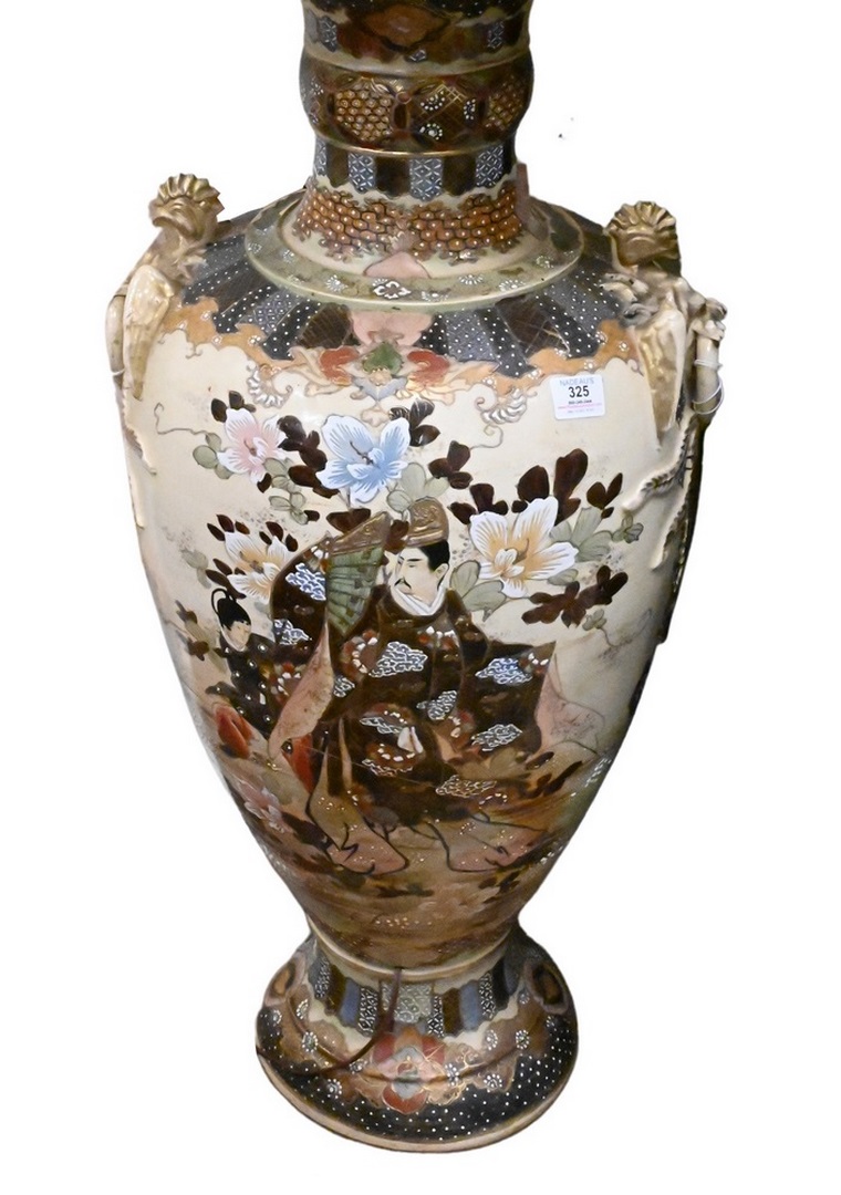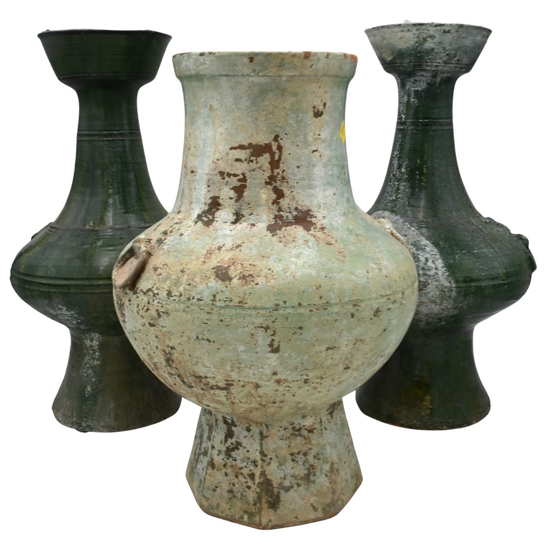 Three Large Pottery Vases, to include a pair of green glazed having foo lion mask handles, along with a pearl green glazed vase having octagon base, height of pair 21 inches, height of green glazed 19 inches. Provenance: Estate of Peter Tillou, Litchfield, Connecticut.