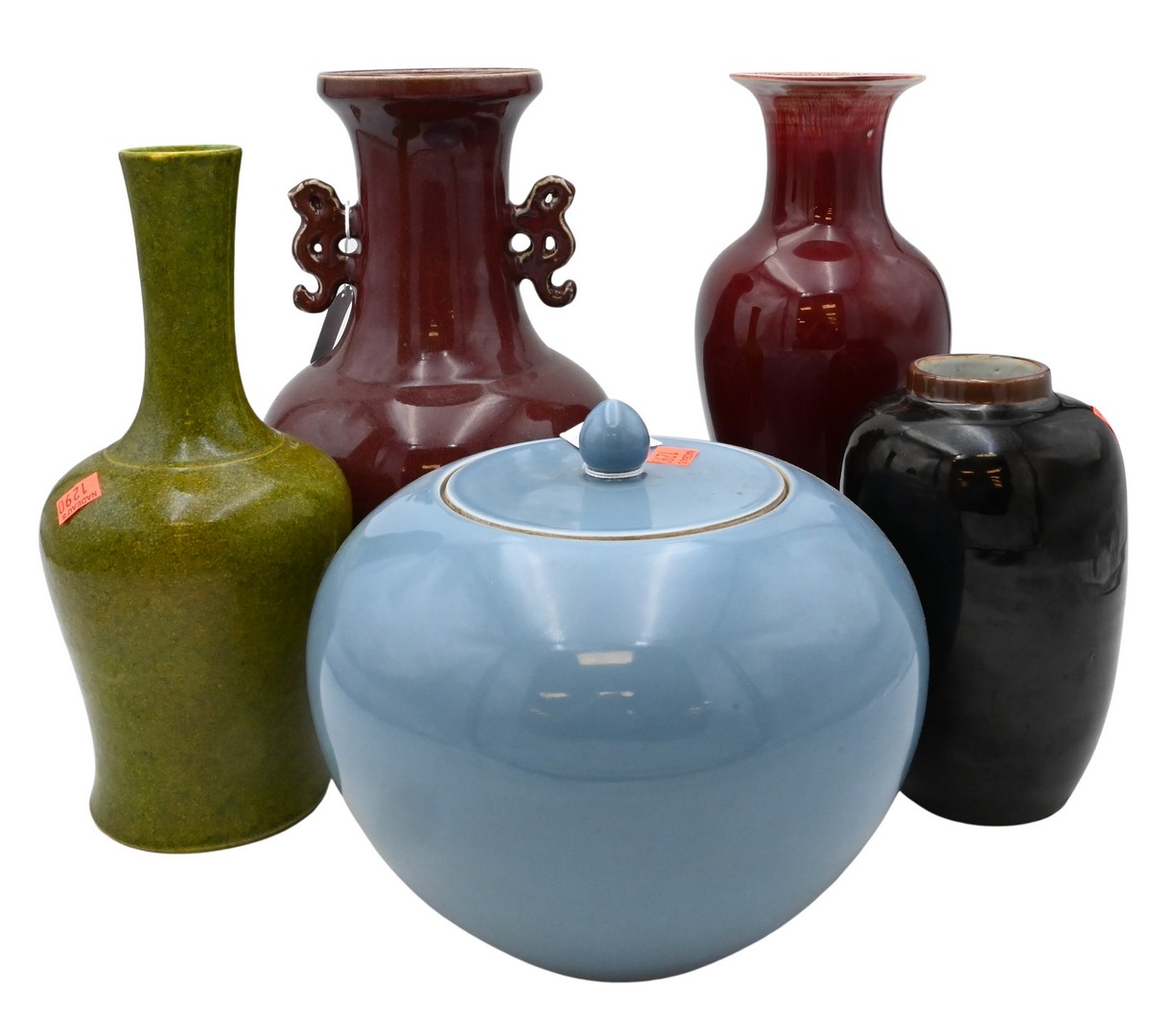 Five Chinese Glazed Porcelain Pieces, to include a mirror black glaze vase, two sang de boeuf glazed vases, a green and yellow vase, along with a light blue ginger jar with cover; tallest 12 inches.