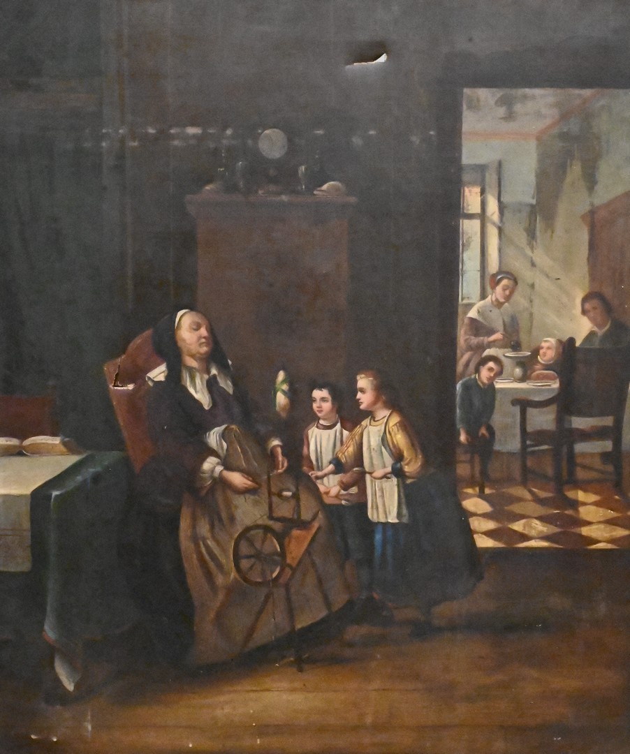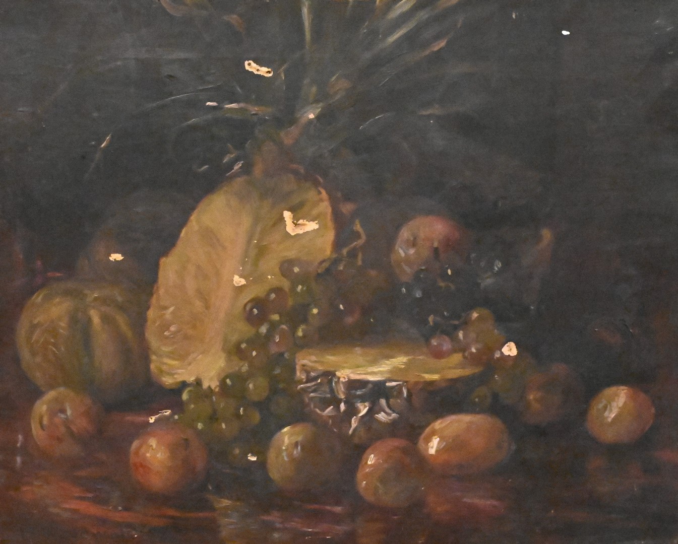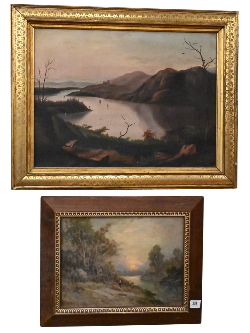 Two Piece Framed Lot, to include a 19th century Continental oil on canvas landscape having boats in bay, 17 1/2″ x 23 1/2″; along with an oil on board landscape having figures, signed indistinctly lower right, 12″ x 16″.