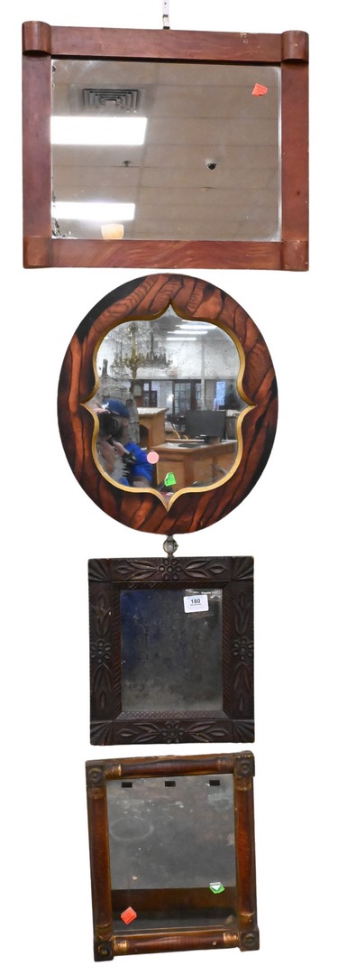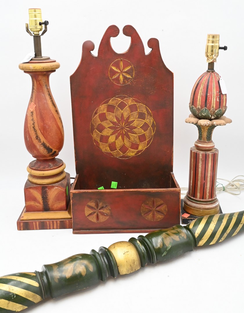 Four Piece Primitive Painted Group, to include two paint decorated lamps, a wall mounted hanging box, along with a green and gold painted Barber wall Mt. half pole, length 46 inches. Provenance: Estate of Peter Tillou, Litchfield, Connecticut.