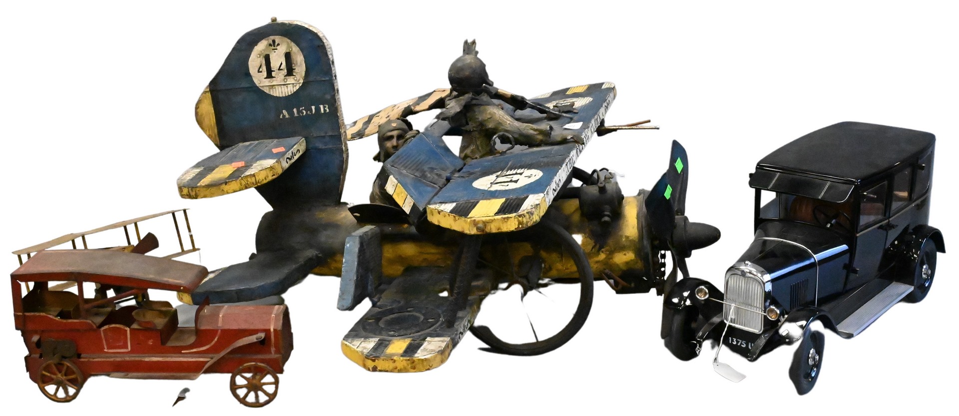 Four Piece Group, to include two painted tin toys, a Dayton Bi-Plane, length 32 inches and a red car; a Folk Art painted tin and wood plane “The Flying Clown”, along with a Citroen B-14 1927 car model. Provenance: Estate of Peter Tillou, Litchfield, Connecticut.