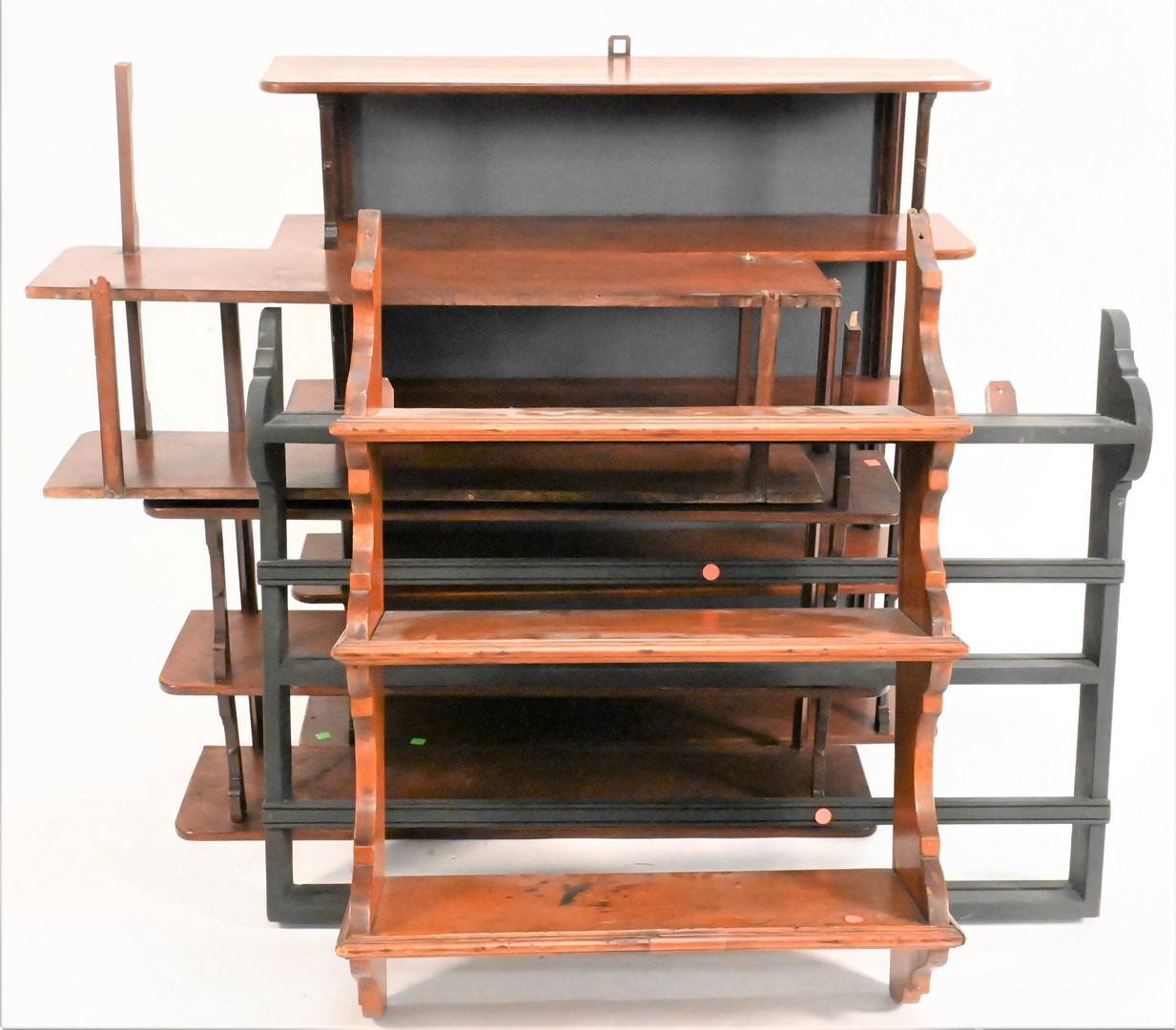 Four Hanging Shelves, to include a pair along with two odd pieces, tallest 38 inches, largest top 9″ x 37″. Provenance: Estate of Peter Tillou, Litchfield, Connecticut.