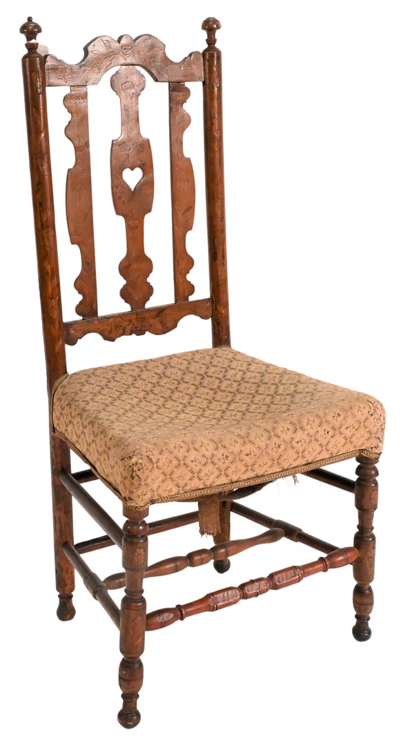 Continental Marquetry Inlaid Side Chair, having heart cutout, upholstered seat having fur/hair interior, on turned legs, 18th century, height 44 1/2 inches, seat height 19 inches. Provenance: An estate from Redding, CT.