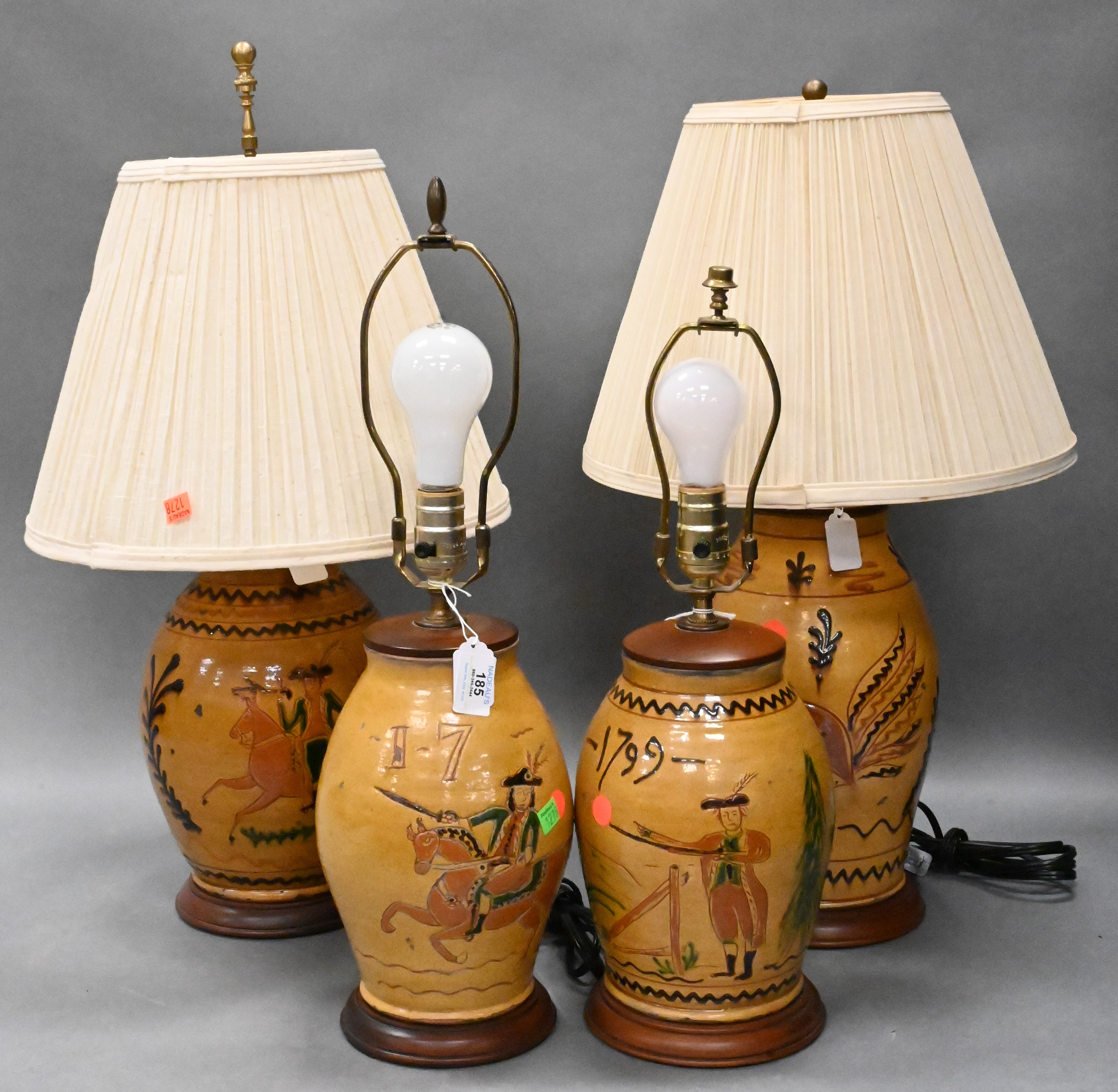 Group of Four Grey Shooner Redware Pottery Jars, made into table lamps, yellow glazed in Early American decoration, all signed on side, tallest 17 inches. Provenance: Estate of Peter Tillou, Litchfield, Connecticut.