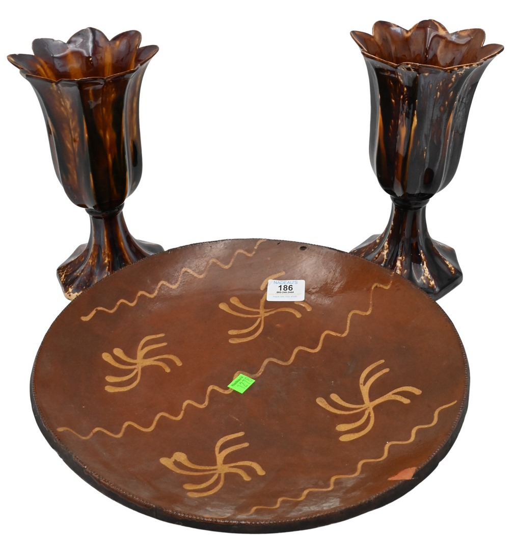 Three Piece Pottery Group, redware slipware charger in brown with yellow decoration, along with tulip form pottery flower vases, charger diameter 15 inches, tulip height 10 inches. Provenance: Estate of Peter Tillou, Litchfield, Connecticut.