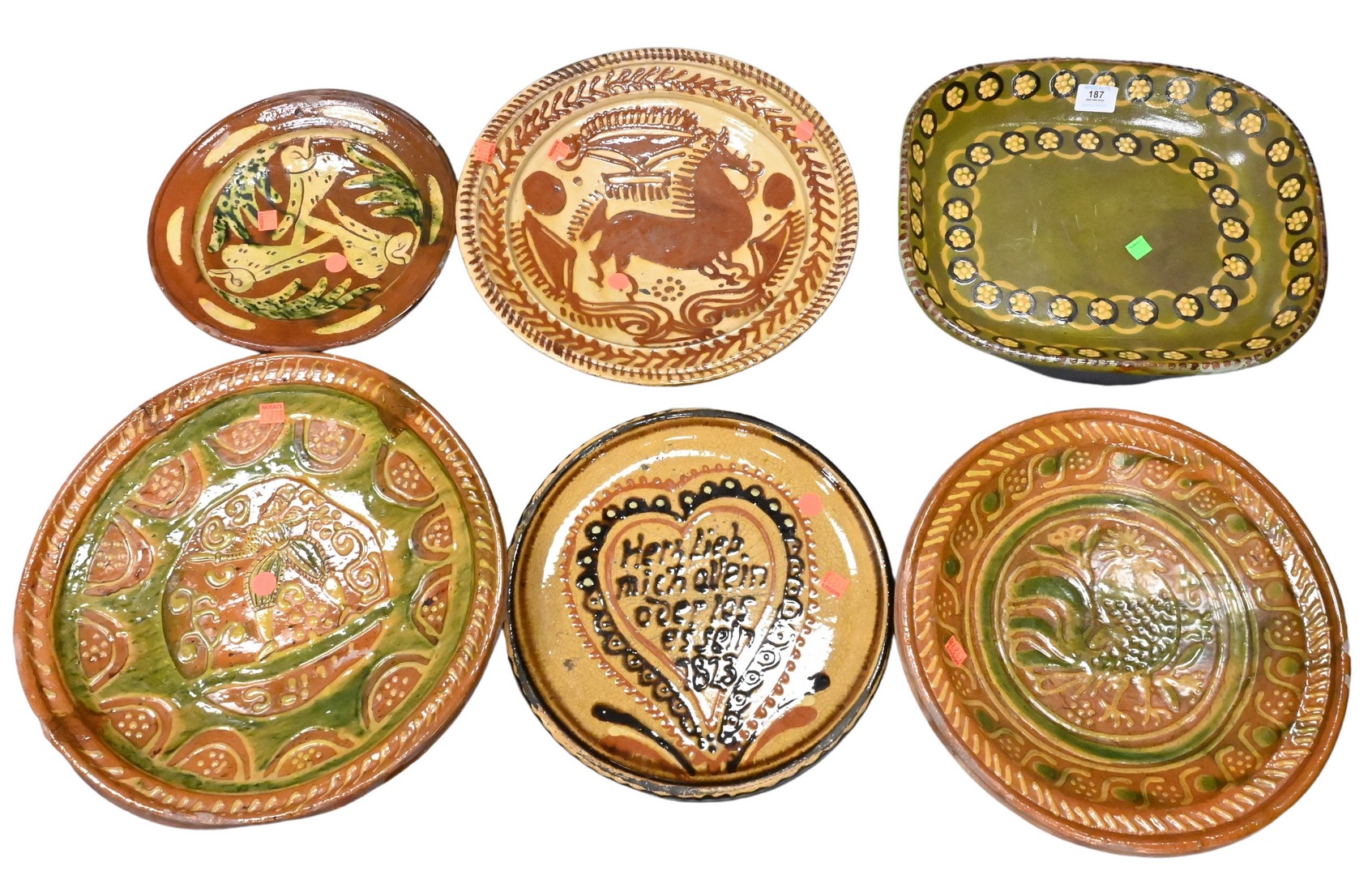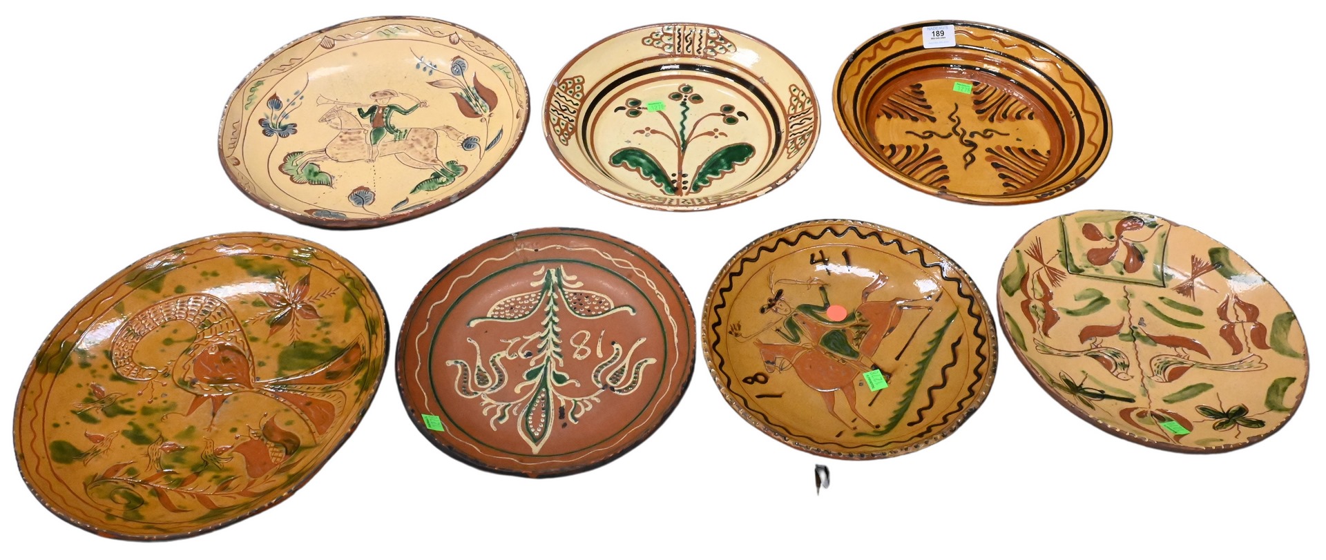 Group of Six Redware Pottery Trays and Chargers, to include yellow, green, along with brown glazed copies, largest in diameter 14 1/2 inches. Provenance: Estate of Peter Tillou, Litchfield, Connecticut.