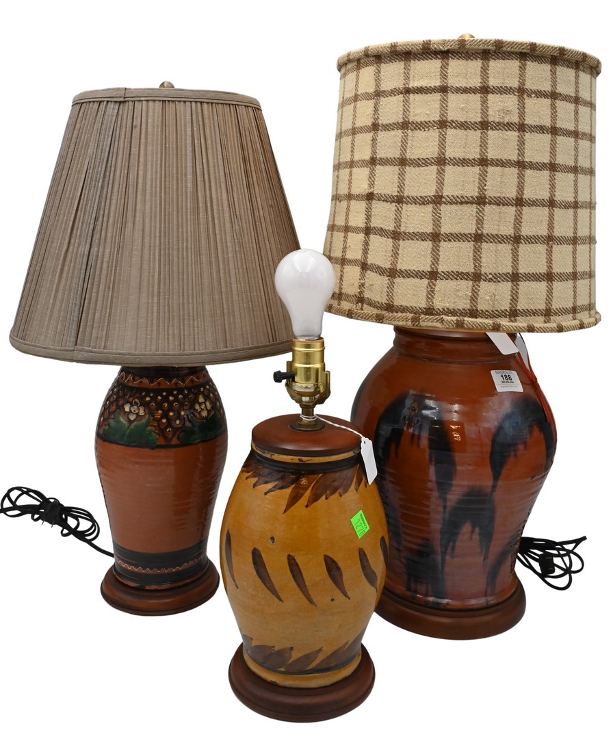 Three Large Redware Jars, made into table lamps, Christopher Woods 1990, having slipware decoration, brown glaze with flowers and a yellow glazed jar, jar height is 27 inches. Provenance: Estate of Peter Tillou, Litchfield, Connecticut.