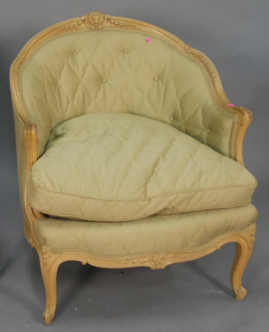 Louis XV style chair with painted frame and light green upholstery.