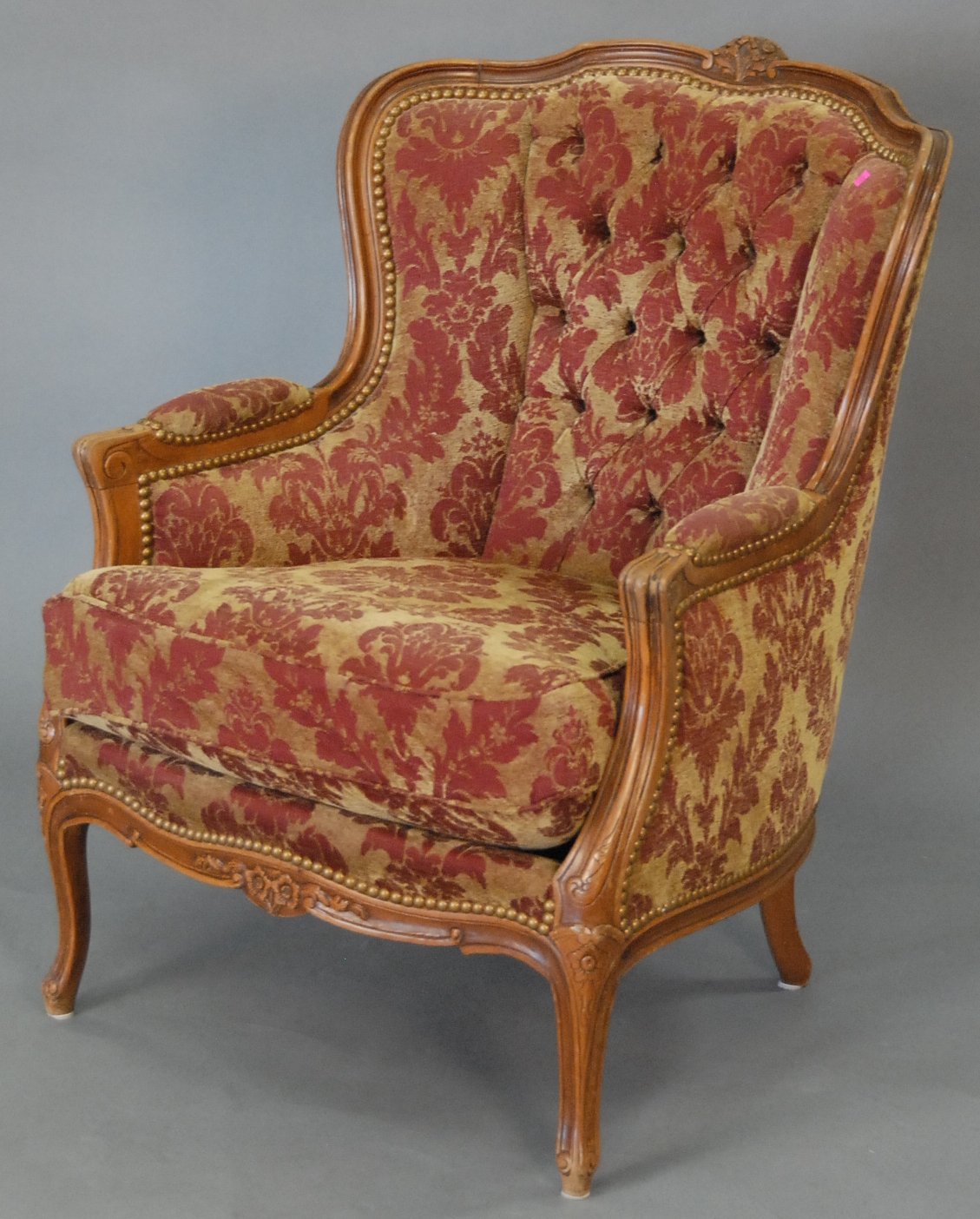 Louis XV style chair with tan and maroon upholstery.