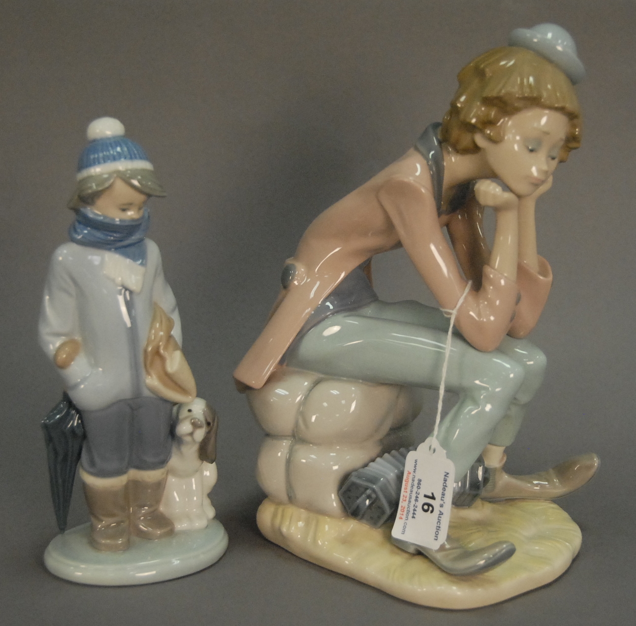 Two Llardros including sad clown with accordion ht. 9 in. and a boy with dog ht. 8 in.