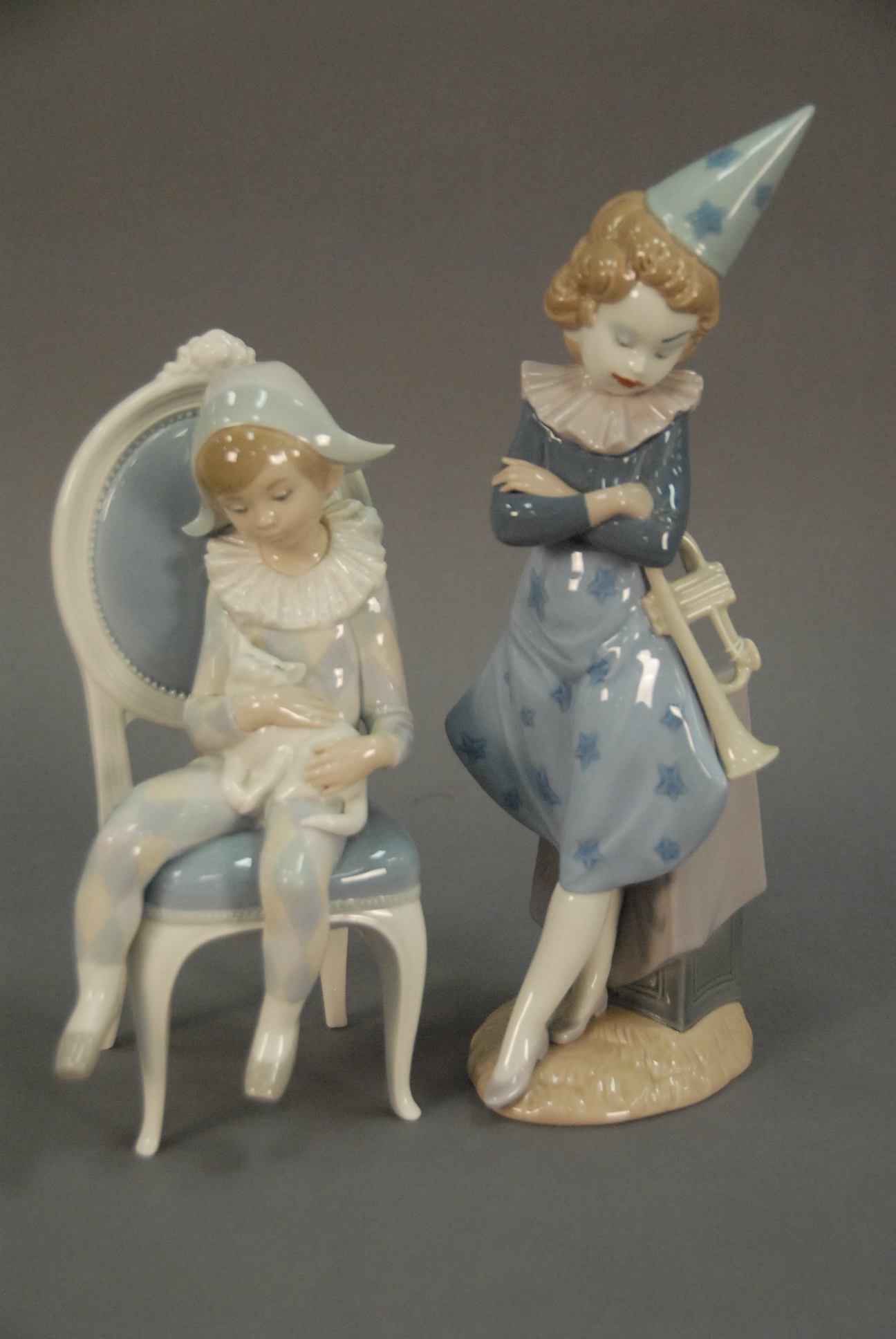Two Lladros figures to include a clown with trumpet retired figure #5060 ht. 13 and Harlequin girl clown seated in chair with cat ht. 10.