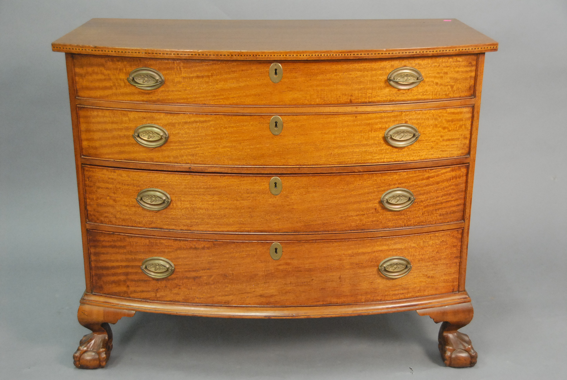 Chippendale style mahogany chest with bowed front and ball and claw feet, wd. 40.