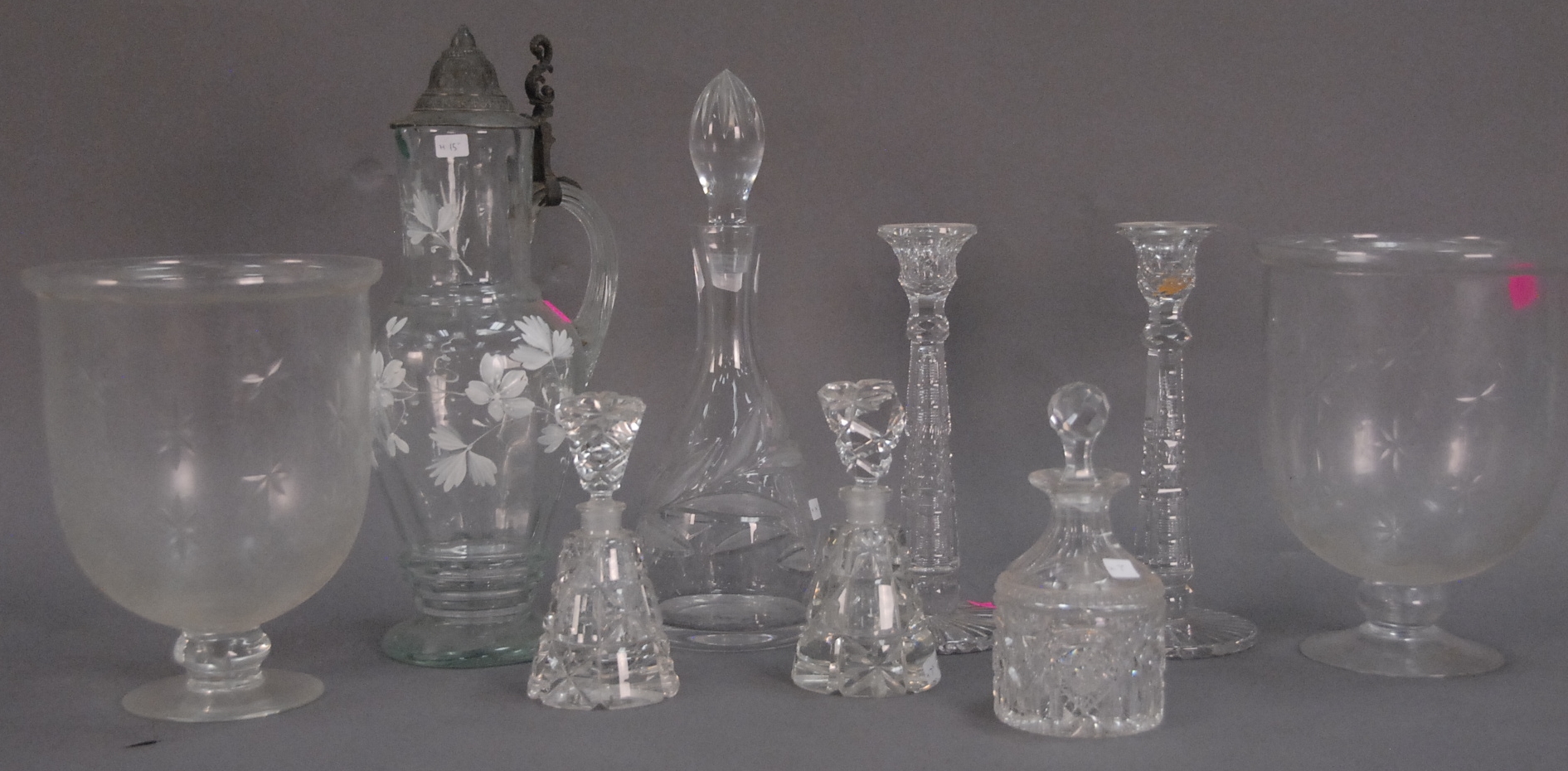Group of nine pieces of cut glass and hand blown glass to include a pair of urns, enameled urn, pair of candlesticks, and four decanters.