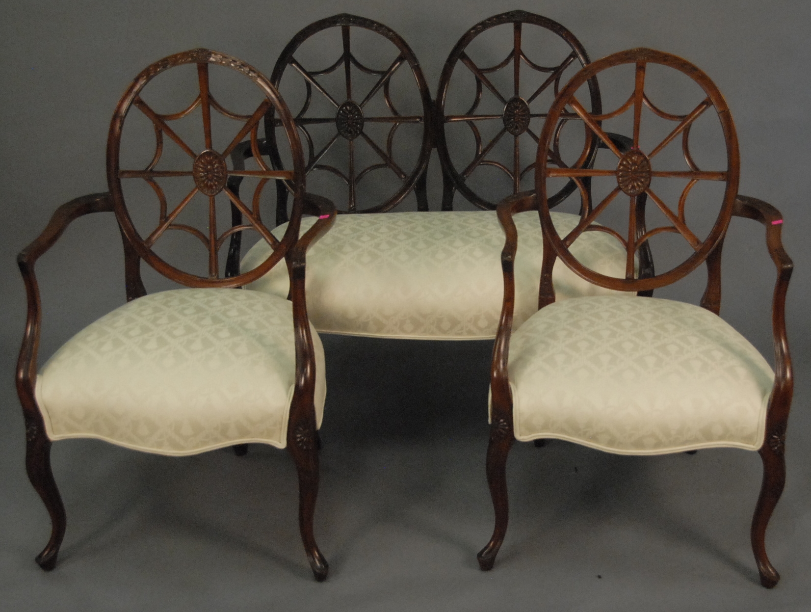 Three piece set including settee lg. 41 and two armchairs all with wheel backs.