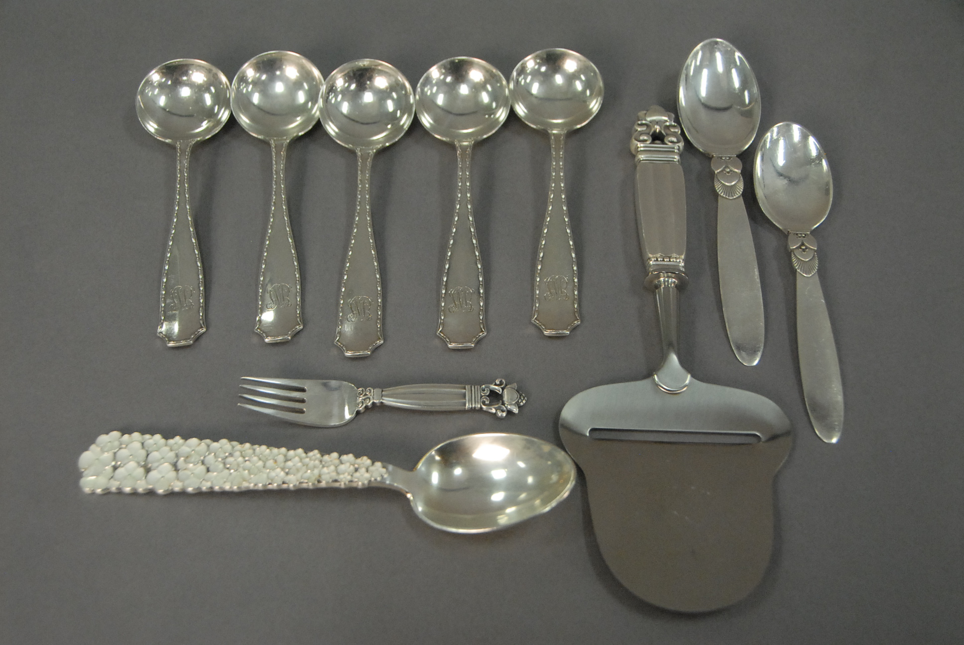 Five Tiffany soup spoons, pair of Georg Jensen spoons, small fork, cheese slicer, and Michelsen spoon, 7.8 t oz.