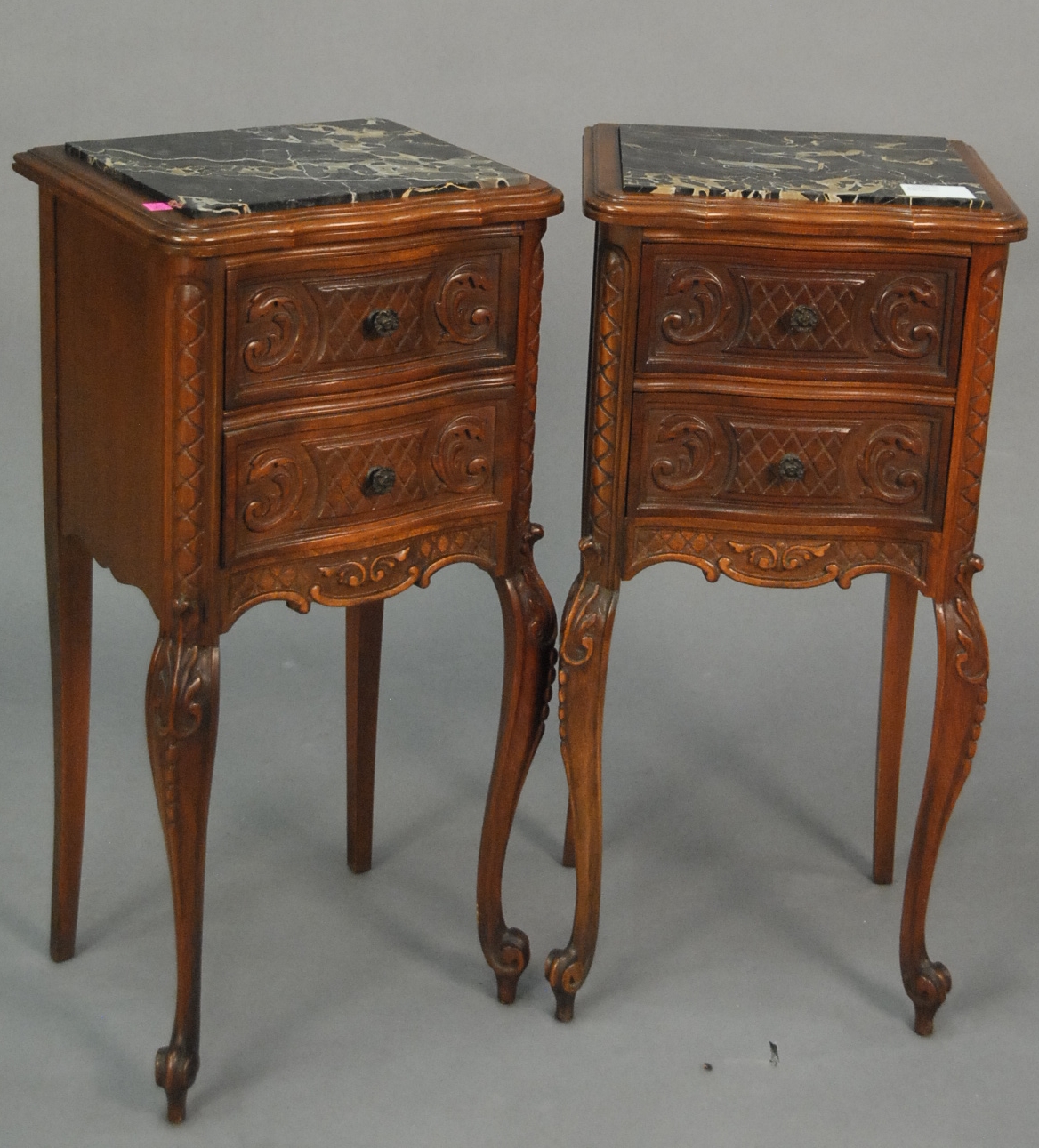 Pair of walnut side tables with inset marble tops signed Revells Chicago, ht. 30 in. top: 12 x 14.