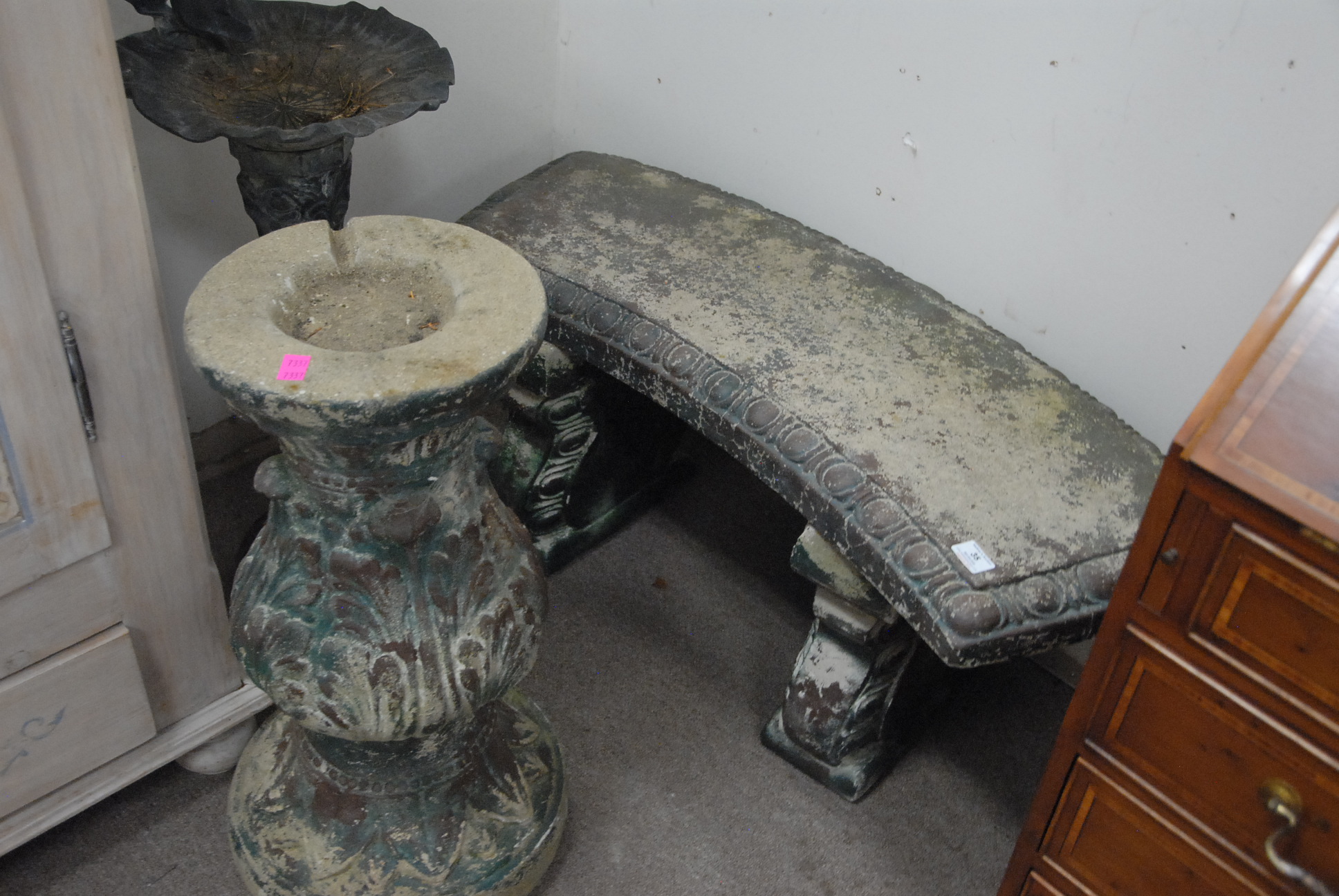 Group of three outdoor pieces to include a cement bench, bird bath and base of a cement bird bath.