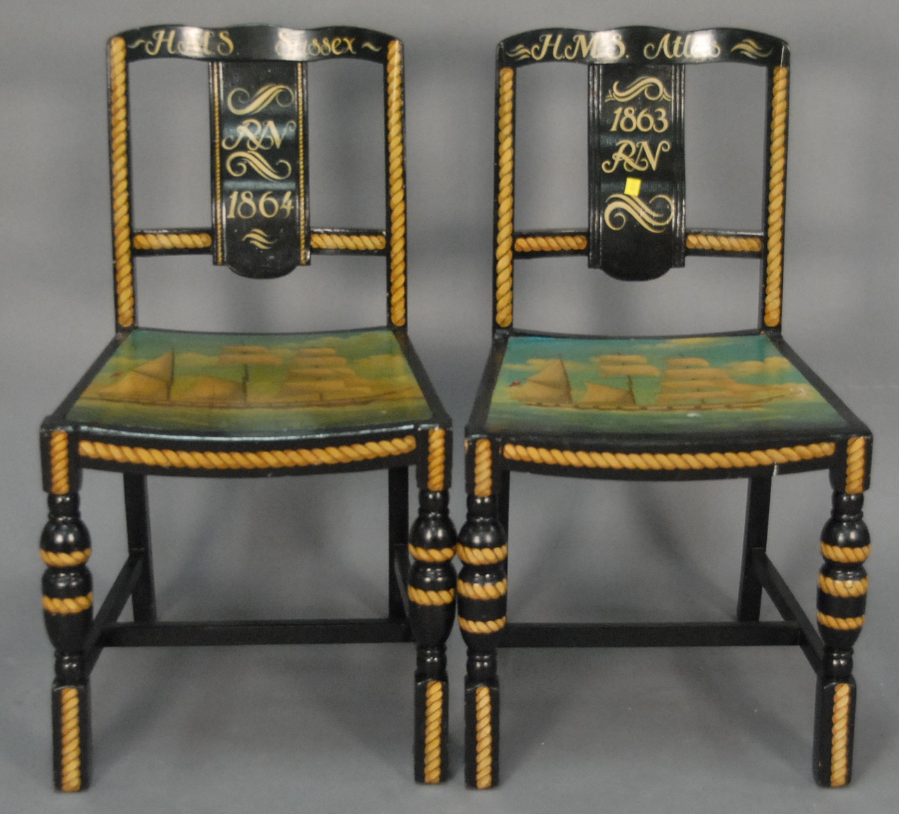 Pair of painted sailing ship chairs Sussex 1864 and Atlas 1863.