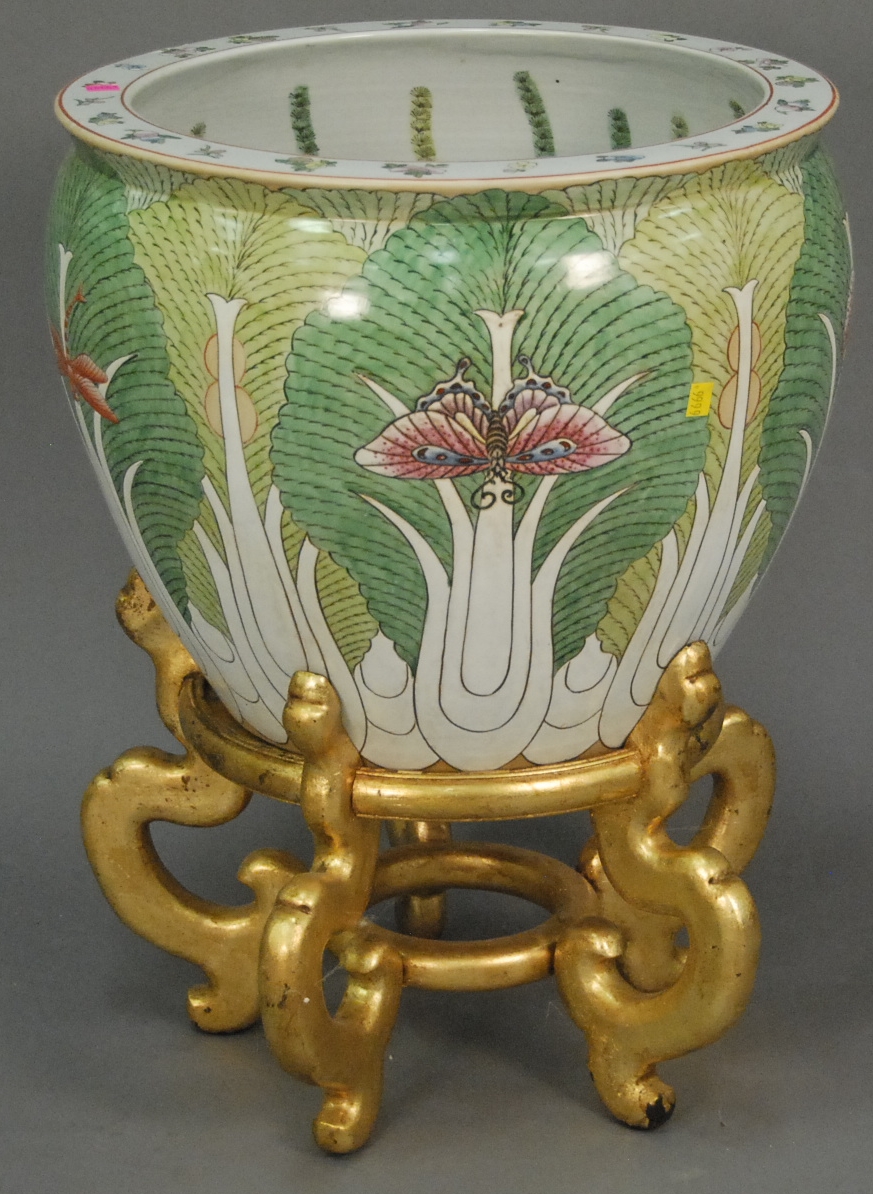 Large porcelain Oriental fish bowl on stand, ht. 26 in. dia. 18 in.