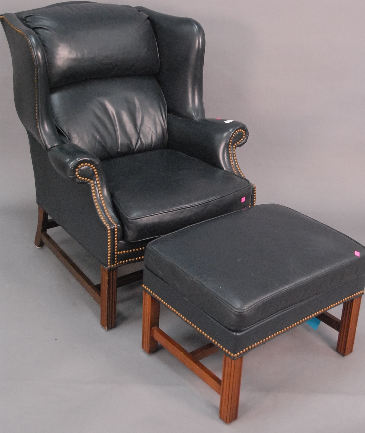 Signed Schaffer Brothers Chippendale style navy blue leather wing chair and ottoman.