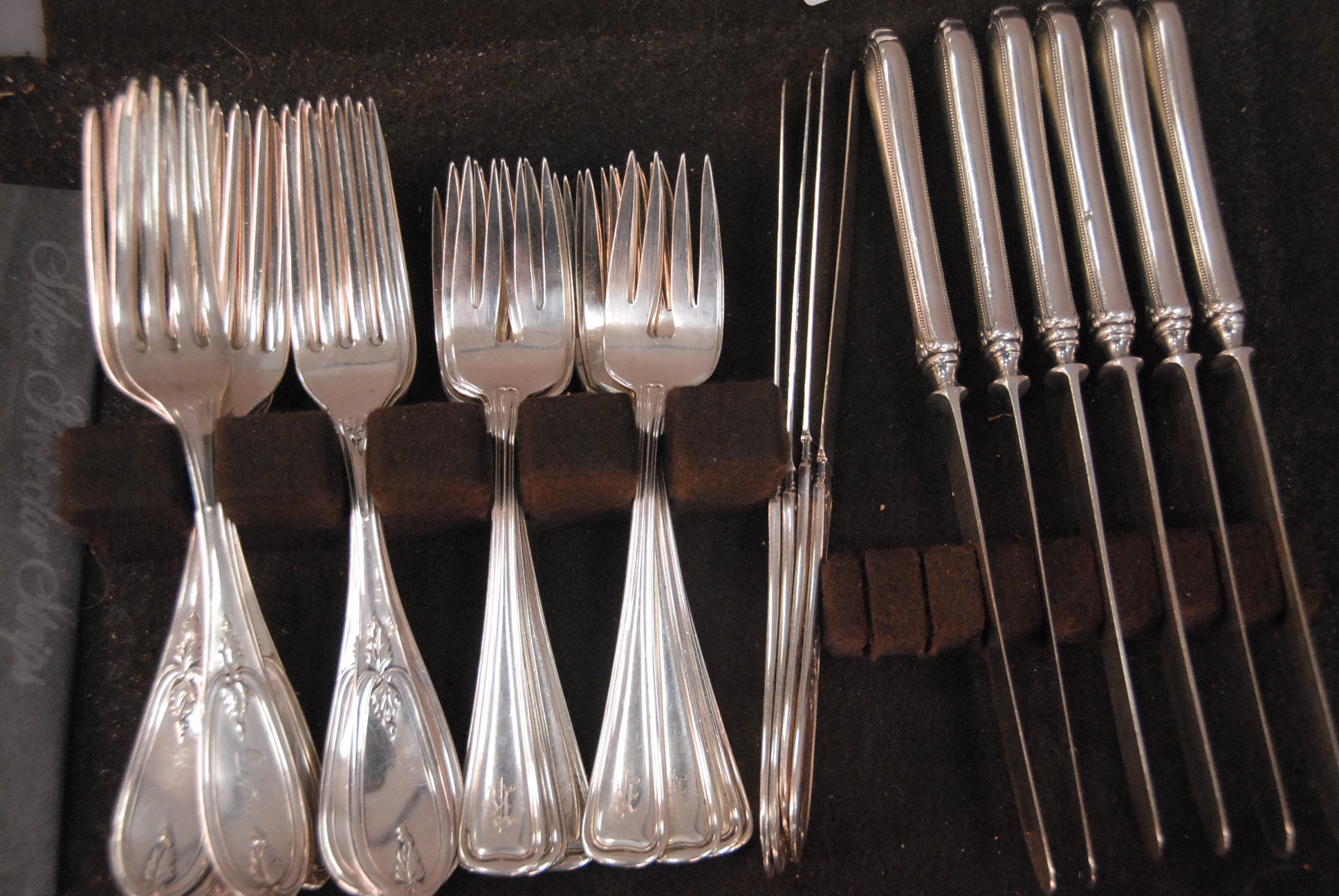 Set of sterling forks, six sterling weighted handled knives, silverplated forks and knives, 15.3 weighable silver.