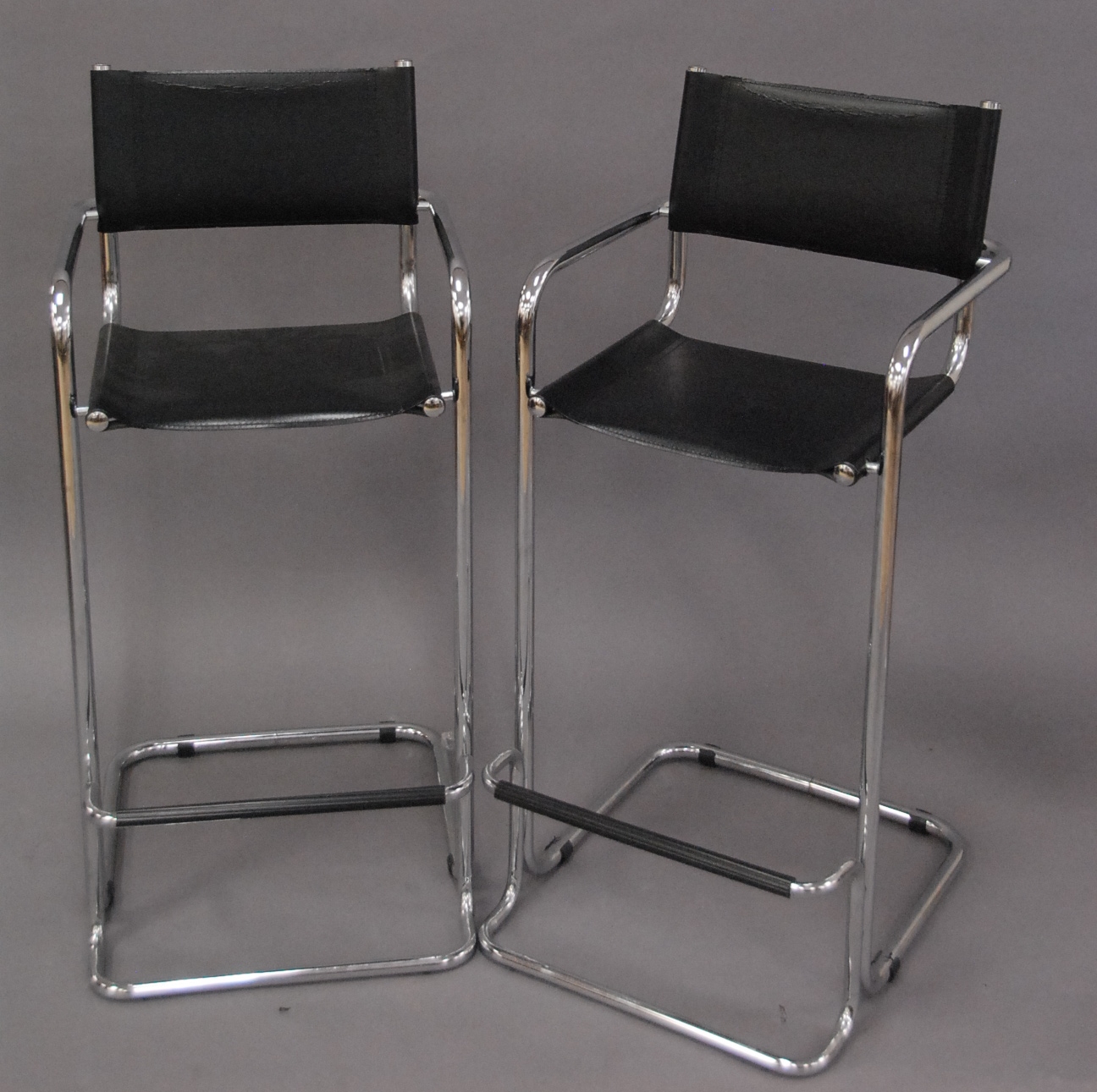 Set of five chrome and leather bar stools, seat ht. 29 in.