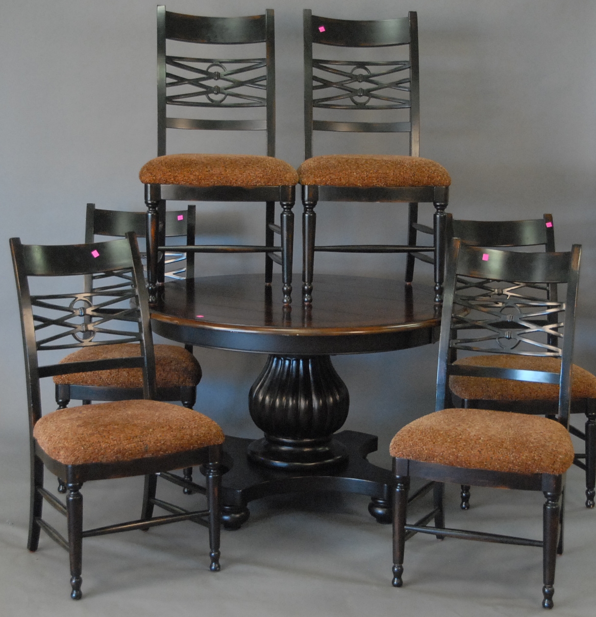 Seven piece dining set with round pedestal table with one 20 leave and 6 chairs, ht. 30 in. dia. 47 in.