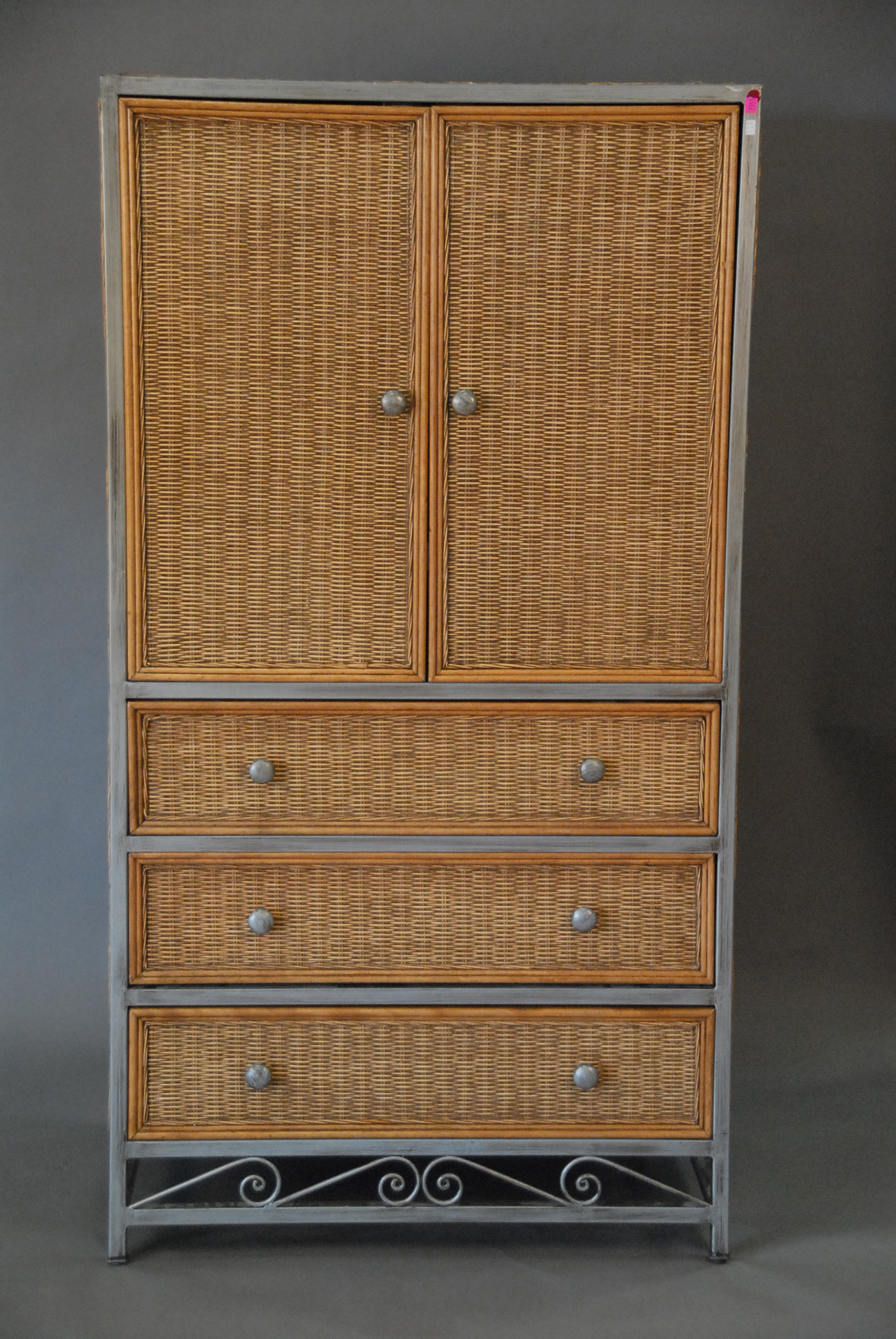 Wicker and iron two door cabinet with three drawers, ht. 67 in. wd. 36 in. dp. 24 in.