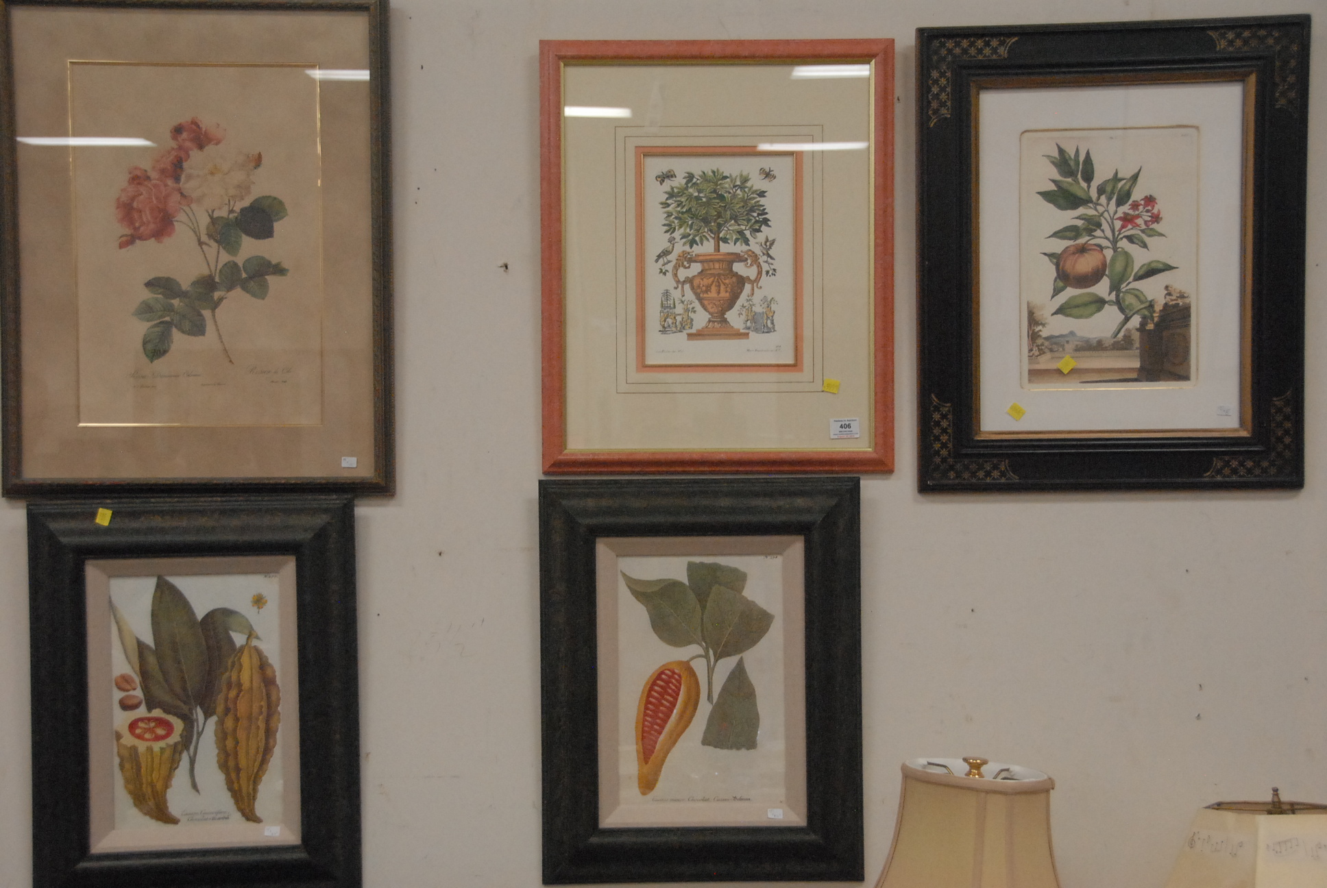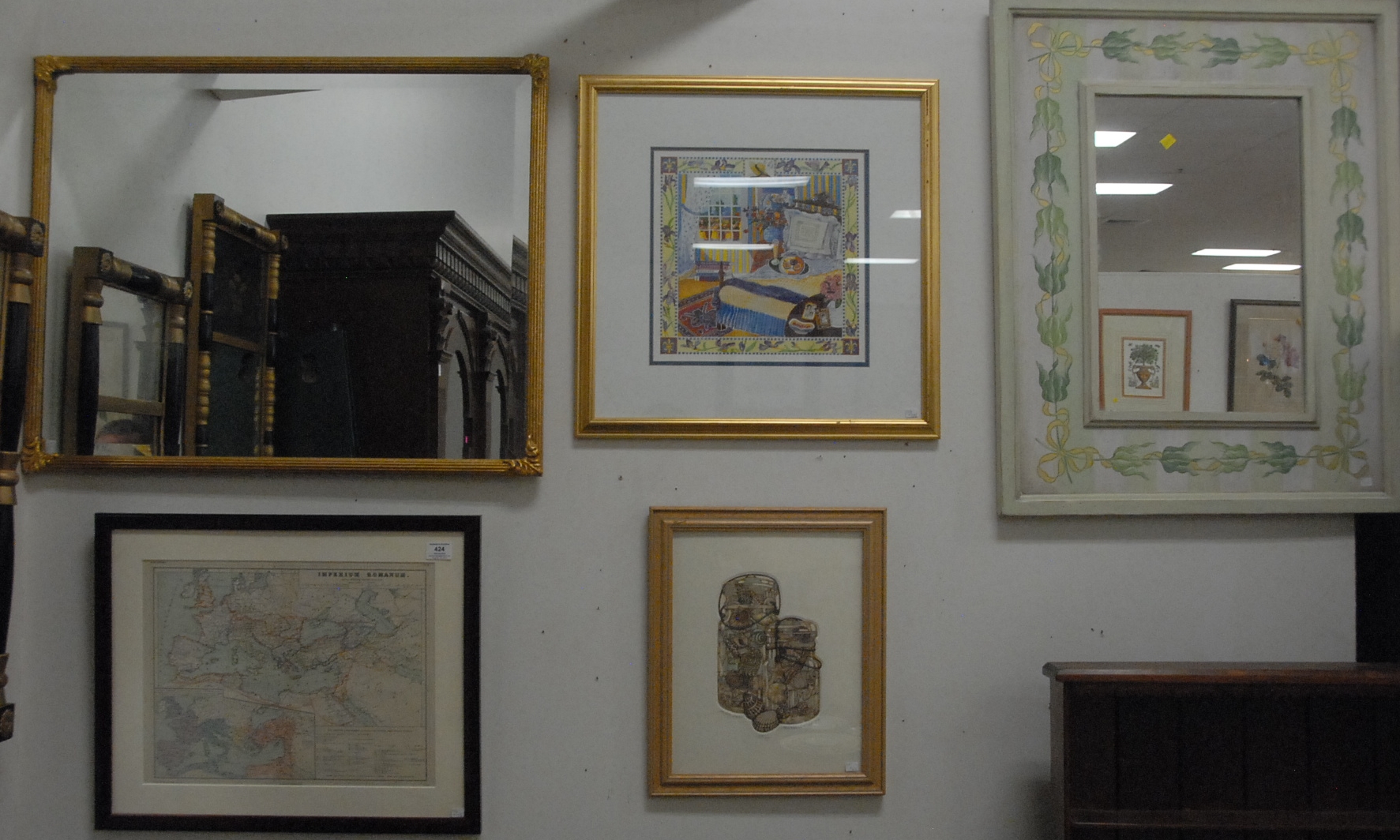 Group of five framed pieces including two mirrors, print of map, etching by Alice Villanueva Scott, and a map.