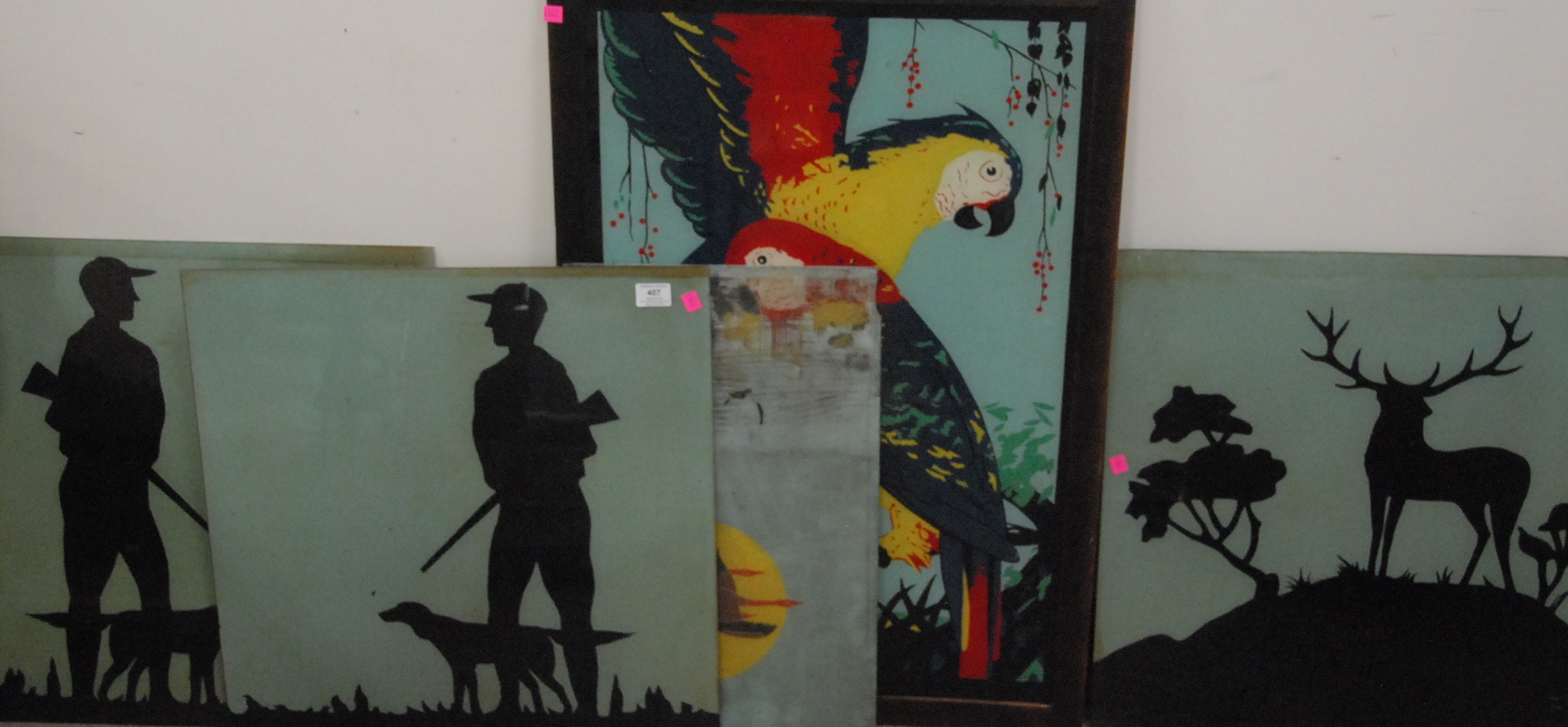Group of five reverse paintings on glass, two of a hunter with dog.