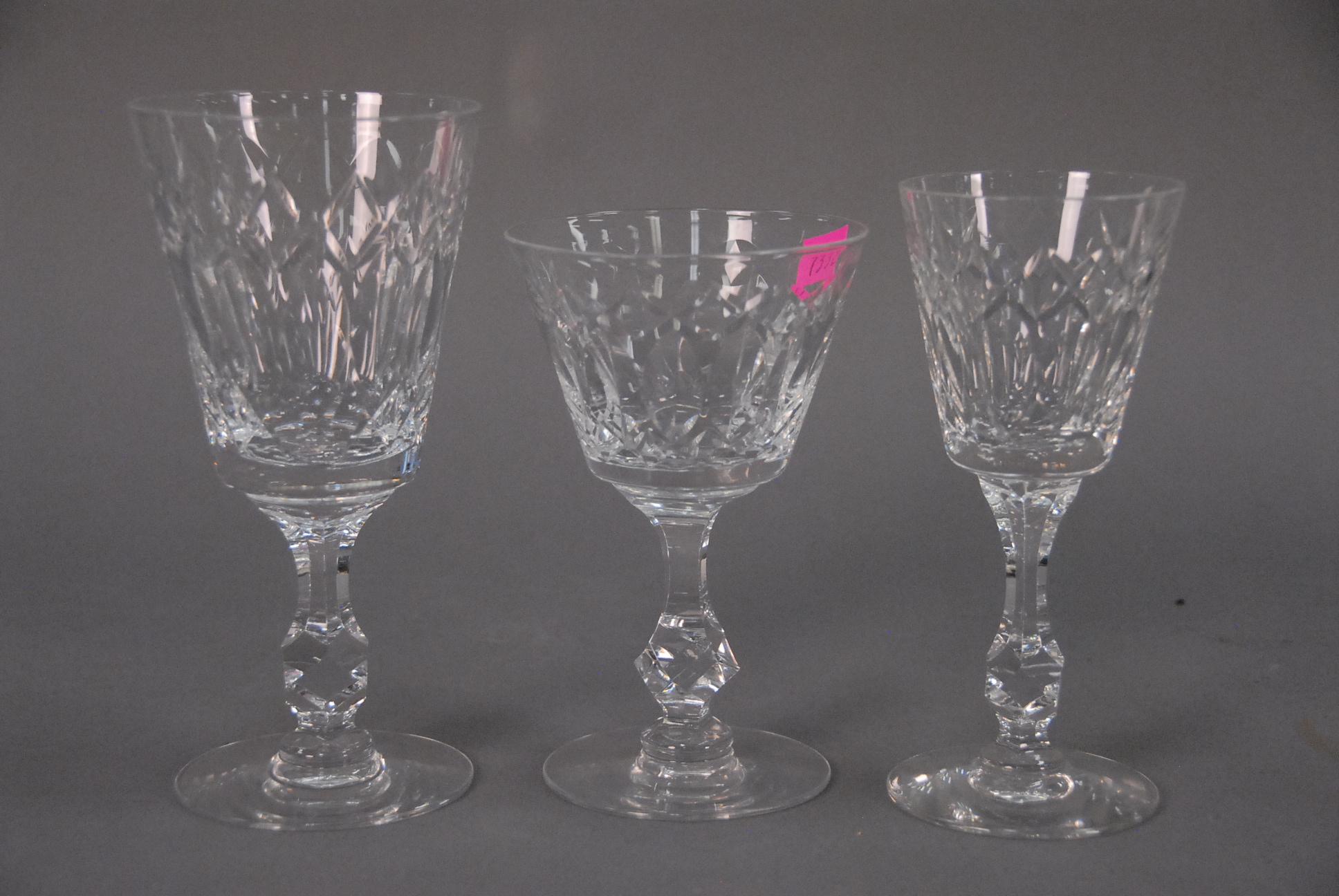 Twenty-five piece set of cut crystal glasses in three sizes, 8 7 1/2 in., 6 7 in., and 11 6 1/2 in.