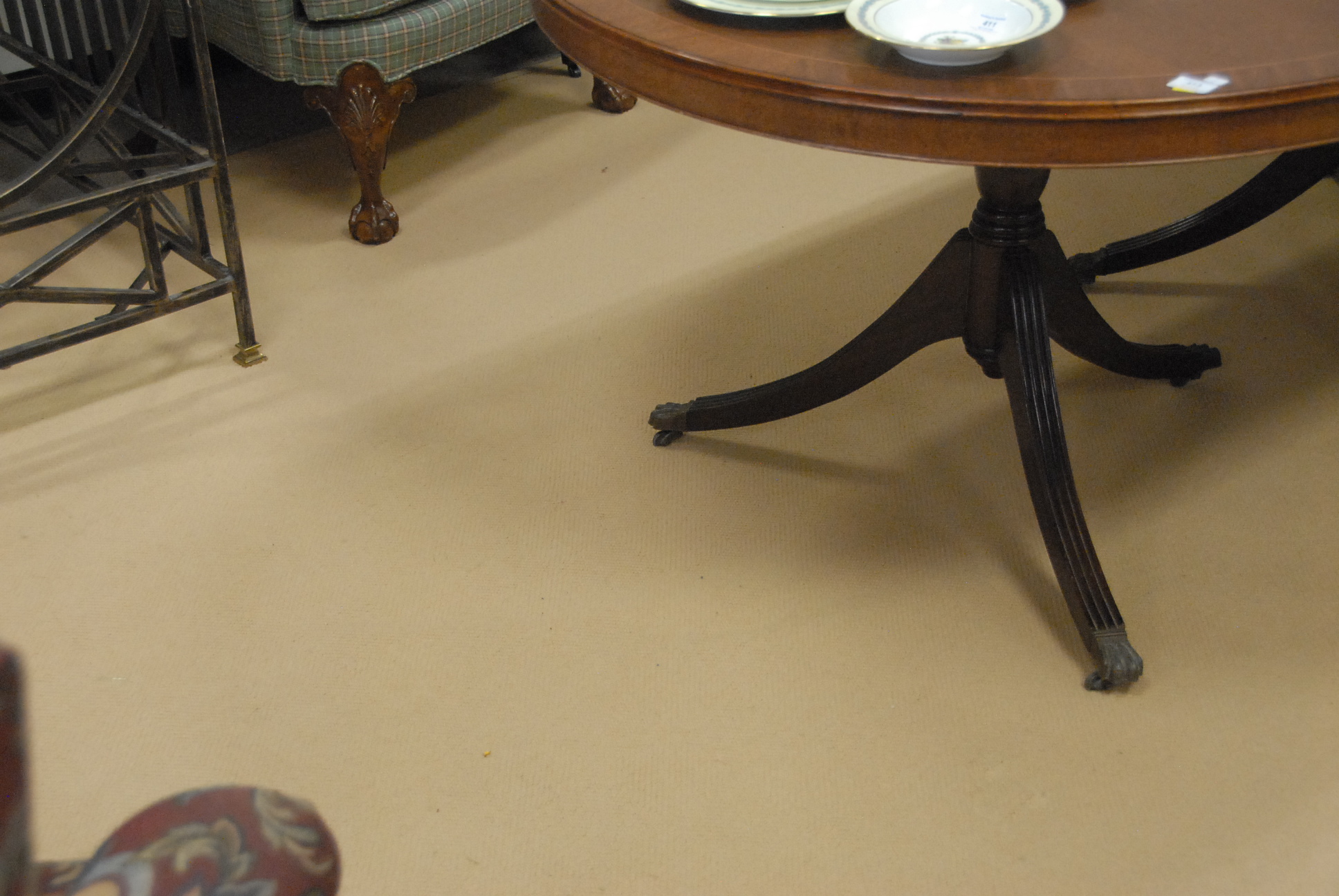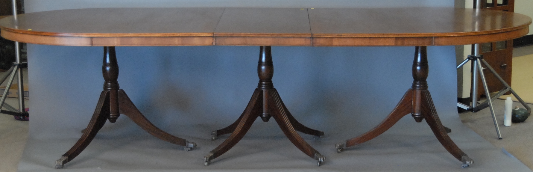 Custom mahogany triple pedestal dining table with banded inlaid top, ht. 30 in. wd. 46 in., top: 116 x 46.