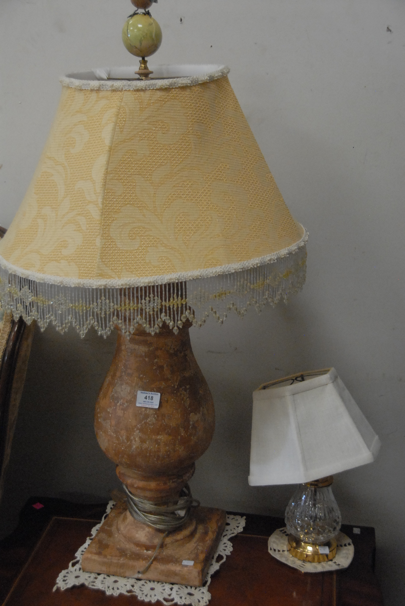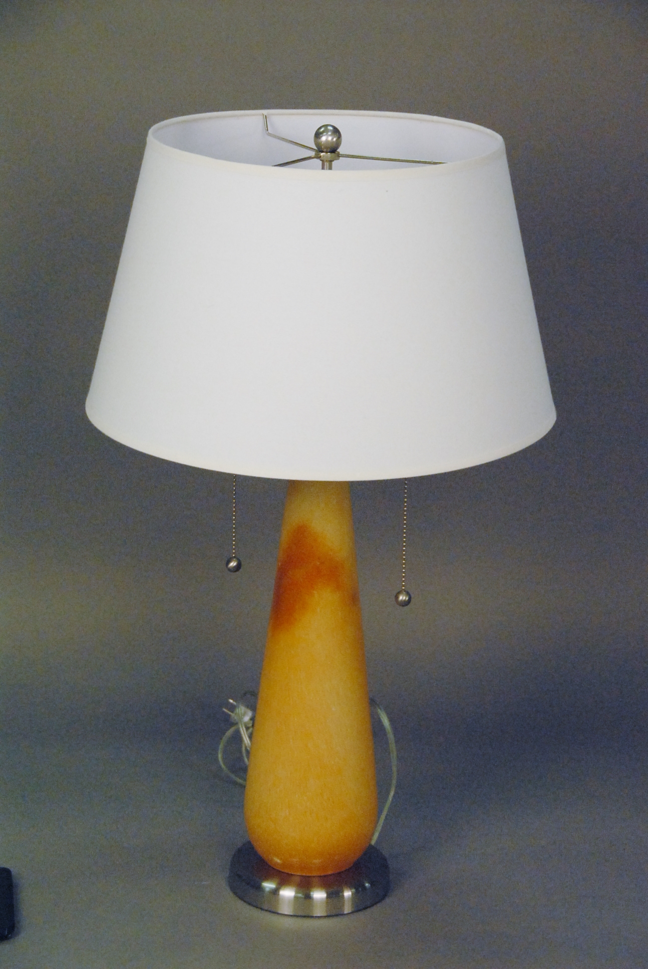 Group of nine table lamps including an alabaster lamp, trumpet made into a lamp, two wood lamps, pair of ceramic lamps, porcelain lamp, and a decorative lamp.