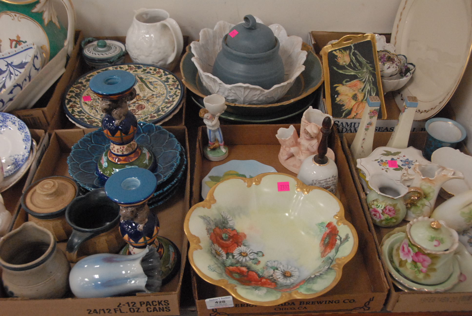Six box lots to include pottery, two Rike candlesticks, Lenox, Nippon, etc.