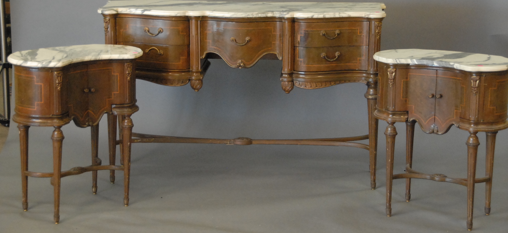 Three piece D’andrea marble top set including two night tables and a dresser.