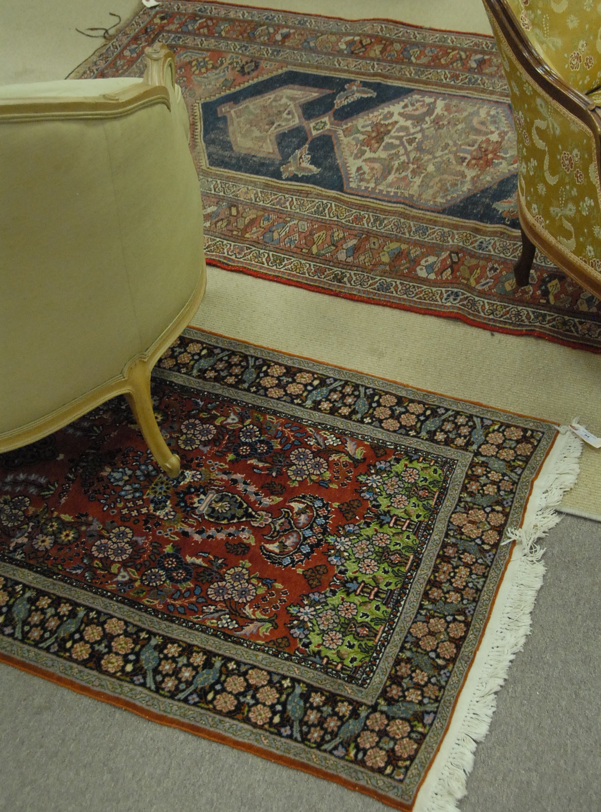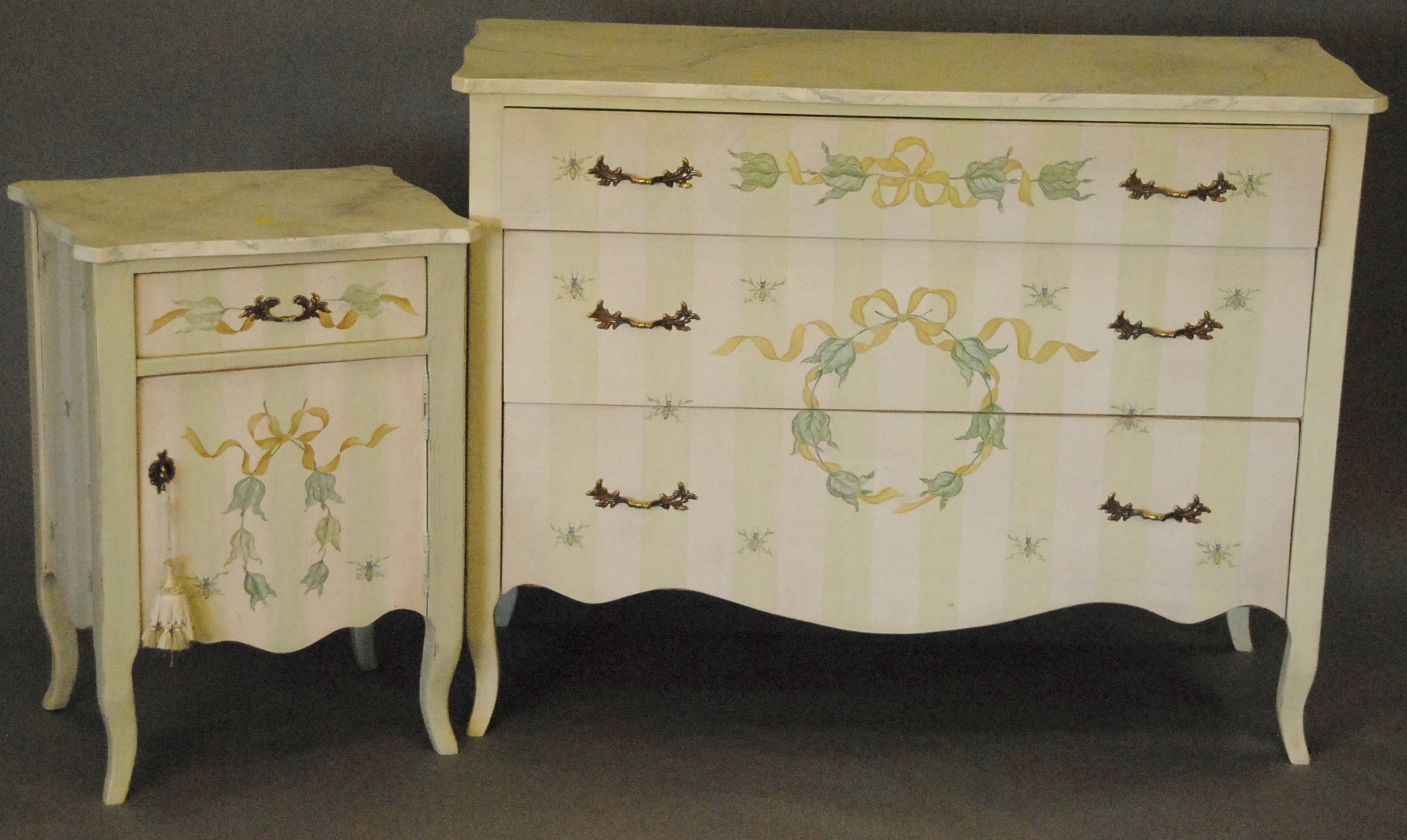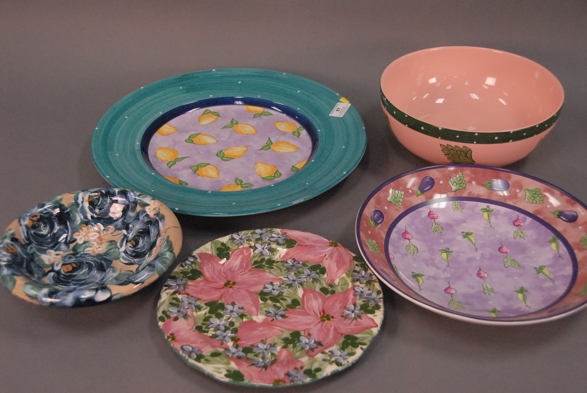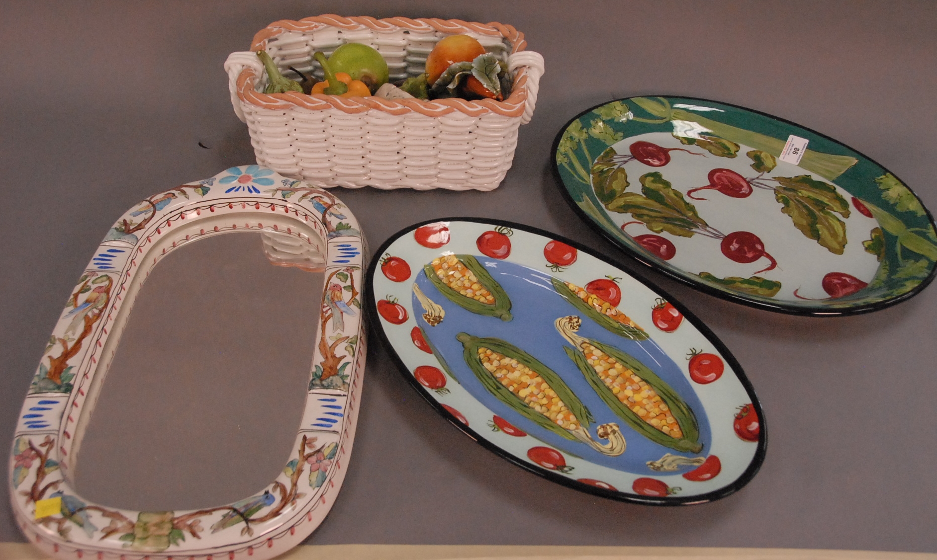 Four piece lot to include two Droll Designs platters, one with radishes and one with corn Nordstrom platter, and hand painted porcelain framed mirror, lg. 16 to 21.